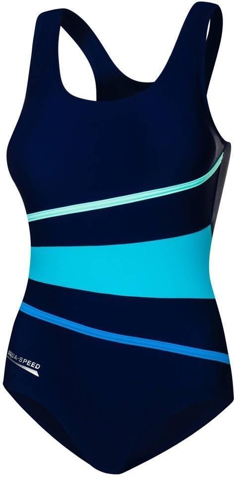 Kostium Kąpielowy Damski Aqua-Speed Stella Kol. 410 granatowo-niebieski Kostium pływacki Stella to doskonale dopasowany, kolorowy strój z niesymetryczną, połyskującą wstawką i lamówkami układającymi się po przekątnej na przodzie, nadając mu wyjątkowy design. Ten stroj pływacki nie tylko optycznie …