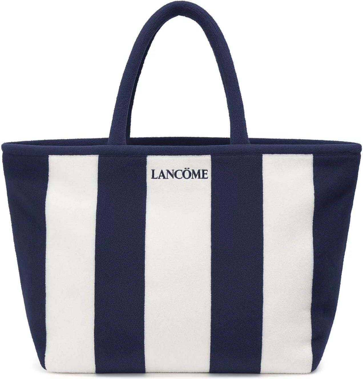 Lancome, letnia torba na plażę Stylowa i praktyczna torba marki Lancôme w wakacyjnym, marynistycznym stylu. Wykonana z miękkiego materiału typu welur w biało-granatowe pasy. Duży rozmiar i wygodne uchwyty sprawiają, że świetnie sprawdzi się zarówno na plaży, jak i podczas codziennych wyjść. Nowa, …