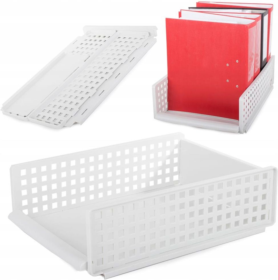 Organizer biurowy na segregatory oraz dokumenty, sprawdzi się w każdym biurze. Dzięki możliwości ułożenia segregatorów w pojemniku, zachowamy porządek w dokumentach. Pojemnik można również wykorzystać do przechowania książek, zeszytów szkolnych, czasopism i innych gadżetów. Pojemnik można rozłożyć i Organizer biurowy na segregatory oraz dokumenty, sprawdzi się w każdym biurze. Dzięki możliwości ułożenia segregatorów w pojemniku, zachowamy porządek w dokumentach. Pojemnik można również wykorzystać do przechowania książek, zeszytów szkolnych, czasopism i innych gadżetów. Pojemnik można rozłożyć i schować np. do szuflady. Kiedy znów będzie nam potrzebny, wystarczy go szybko zmontować i umieścić w nim potrzebne dokumenty. Konstrukcja organizera jest lekka, wykonana z tworzywa sztucznego. Wysokie ścianki, zapobiegają przewracaniu się segregatorów. SPECYFIKACJA TECHNICZNA Kod produktu: 01652 Materiał wykonania: tworzywo sztuczne Ażurowa, lekka konstrukcja Składany Mocowania na zatrzaski Funkcjonalny Możliwość dołożenia kolejnej półki Kolor: biały WYMIARY Długość: 44cm Szerokość: 30cm Wysokość: 13cm ZESTAW ZAWIERA Fabrycznie nowy organizer biurowy na dokumenty Oryginalne opakowanie