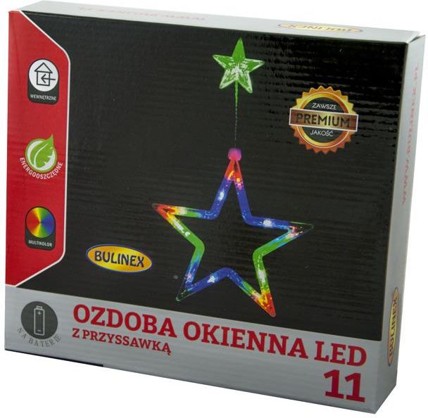 Ozdoba okienna LED gwiazda 11 diod multikolor Ozdoba okienna do użytku wewnętrznego, wyposażona w wygodną przyssawkę, dzięki której możemy zamocować ją np. do okna. Przygotowana w formie gwiazdy mieni się na wiele kolorów z pomocą 11 diod LED. Zasilana trzema bateriami AAA (baterie nie znajdują się w opakowaniu). Ilość diod LED: 11 Możliwość łączenia: nie Barwa: kolorowe Zastosowanie: wewnętrzne Kształt: gwiazda