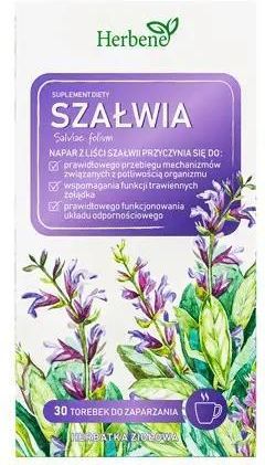 Opis: Herbene Szałwia to suplement diety w postaci saszetek do zaparzania, który w swoim składzie zawiera liście szałwii lekarskiej. Produkt przeznaczony dla osób dorosłych.. Opis: Herbene Szałwia to suplement diety w postaci saszetek do zaparzania, który w swoim składzie zawiera liście szałwii lekarskiej. Produkt przeznaczony dla osób dorosłych.. Składniki: 100% liści szałwii lekarskiej (Salvia officinalis L.).. Masa netto: 36 g (30 x 1,2 g). Właściwości składników: Liście szałwii lekarskiej – wspierają prawidłowe funkcjonowanie układu odpornościowego, a także funkcję trawienne żołądka. . Zalecane dzienne spożycie: Dorośli: stosować 1 torebkę 2 razy dziennie. 1 torebkę zalać 200 ml wrzącej wody, zaparzać pod przykryciem przez 5-10 minut. Zaleca się pić 2 razy dziennie po 1 filiżance.. Ostrzeżenia dotyczące bezpieczeństwa: Dzieci poniżej 12. roku życia, osoby przewlekle chore, przyjmujące leki, kobiety w ciąży i karmiące piersią przed zastosowaniem produktu powinny skonsultować się z lekarzem. Nie należy przekraczać zalecanej dziennej porcji Suplement diety nie może być stosowany jako substytut (zamiennik) zróżnicowanej diety. Suplement diety jest środkiem spożywczym, którego celem jest uzupełnienie normalnej diety. Suplement diety nie ma właściwości leczniczych. Dla utrzymania prawidłowego stanu zdrowia należy stosować zróżnicowaną dietę i prowadzić zdrowy tryb życia Przechowywać w temperaturze pokojowej Przechowywać w sposób niedostępny dla małych dzieci .