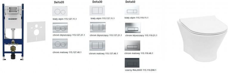 Zestaw 6w1 - gotowy do montau !!! Elementy zestawu: 1.Kompletny stela GEBERIT DUOFIX DELTA stela podtynkowy do wc 112cm - 111.153.00.1 wsporniki montaowe 111.813.00.1 2. Podkadka wyguszajca oryginalna GEBERIT - 156.050.00.1 3. Przycisk do wyboru jeden z modeli w wybranym wariancie kolorystycznym DELTA 20biay, chrom poysk lub chrom matowy DELTA 30biay, chrom poysk lub chrom matowy DELTA 50biay, czarny, chrom poysk lub chrom matowy 4.Muszla i deska wolnoopadajaca Roca NEXO RIMLESS - A34H64L000 muszla wiszca - A34664L000 deska wolnoopadajca slim - A801C4200U Po zakupie prosimy w uwagach wpisa wybrany przycisk !!!