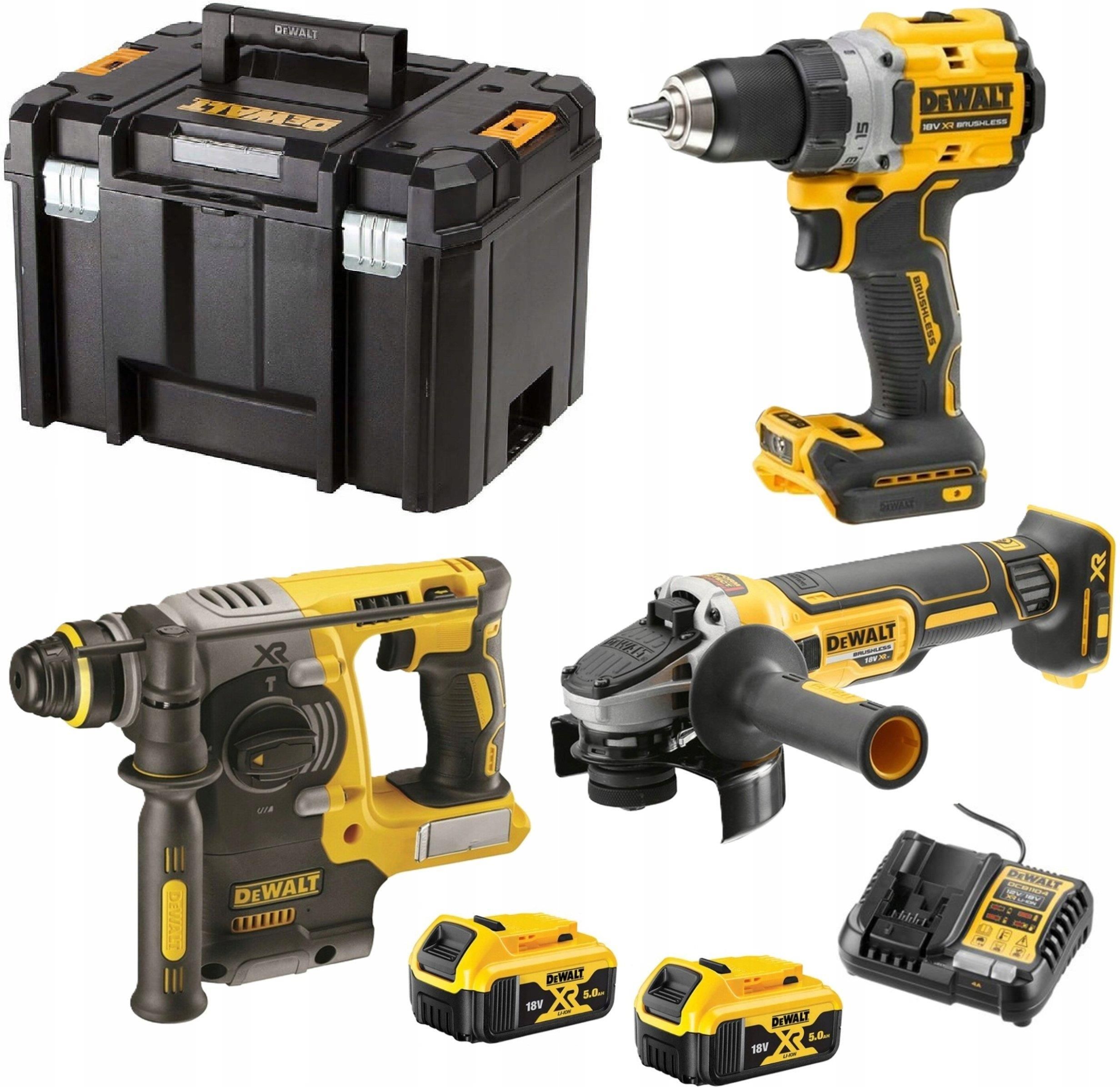 DeWalt DCK330P2T – zestaw elektronarzędzi COMBO XR 18 V, 3 narzędzia, 2×5 Ah, walizka TSTAK Profesjonalny zestaw akumulatorowych elektronarzędzi DeWalt XR przeznaczony do intensywnej pracy na budowie, w warsztacie oraz podczas montażu i serwisu. W komplecie znajdują się trzy wydajne urządzenia z silnikami bezszczotkowymi: wiertarko-wkrętarka DCD800, młotowiertarka DCH273 oraz szlifierka kątowa DCG405. Zasilanie zapewniają dwa pojemne akumulatory XR Li-Ion 18 V 5 Ah, które gwarantują długi czas pracy i pełną mobilność bez kabli. Całość zapakowana jest w solidną walizkę TSTAK ułatwiającą transport i przechowywanie. Zestaw został zaprojektowany z myślą o wymagających użytkownikach. Narzędzia oferują wysoką moc, trwałość oraz nowoczesne systemy bezpieczeństwa i komfortu pracy, dzięki czemu sprawdzą się zarówno w profesjonalnych zastosowaniach, jak i zaawansowanych pracach domowych. Wiertarko-wkrętarka DeWalt DCD800 Kompaktowa konstrukcja i moment obrotowy do 90 Nm umożliwiają wydajne wiercenie oraz wkręcanie w drewnie i metalu. Dwubiegowa przekładnia pozwala dobrać prędkość do rodzaju pracy, a 15-stopniowa regulacja momentu zapewnia precyzję. Wbudowana dioda LED poprawia widoczność w słabo oświetlonych miejscach, a niewielka długość ułatwia pracę w ciasnych przestrzeniach. Młotowiertarka DeWalt DCH273 SDS-Plus Wszechstronne narzędzie do wiercenia, wiercenia z udarem i dłutowania. Energia udaru 2,1 J pozwala na efektywne wiercenie w betonie do 24 mm. System redukcji wibracji zwiększa komfort użytkowania, a elektroniczne sprzęgło podnosi bezpieczeństwo. Idealna do prac instalacyjnych, montażowych oraz lekkiego podkuwania. Szlifierka kątowa DeWalt DCG405 125 mm Profesjonalna szlifierka do cięcia i szlifowania różnych materiałów. Silnik bezszczotkowy zapewnia wysoką wydajność i długą żywotność, a prędkość 9000 obr./min gwarantuje szybkie tempo pracy. Elektroniczny hamulec, sprzęgło przeciwodrzutowe oraz funkcja łagodnego startu zwiększają bezpieczeństwo i kontrolę nad urządzeniem. Beznarzędziowa regulacja osłony i wygodna rękojeść boczna poprawiają ergonomię. Najważniejsze dane techniczne Wiertarko-wkrętarka DCD800: 18 V, 90 Nm, 0–650/2000 obr./min, uchwyt 1,5–13 mm, masa 1,28 kg Młotowiertarka DCH273: 18 V, 2,1 J, 0–1100 obr./min, do 4600 ud./min, SDS-Plus, beton 24 mm Szlifierka DCG405: 18 V, tarcza 125 mm, 9000 obr./min, gwint M14 Zawartość zestawu wiertarko-wkrętarka DeWalt DCD800 młotowiertarka DeWalt DCH273 SDS-Plus szlifierka kątowa DeWalt DCG405 2 akumulatory XR Li-Ion 18 V 5 Ah DCB184 ładowarka wielonapięciowa DCB1104 walizka transportowa TSTAK