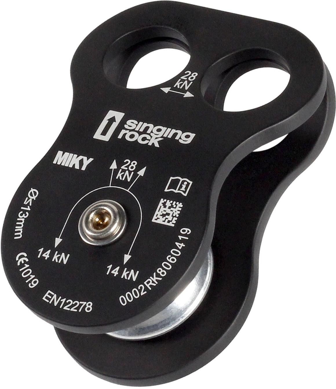 Lekki bloczek Singing Rock Miky z dwoma otworami montażowymi. Przeznaczony do prac arborystycznych. Zastosowanie z węzłem prusikiem. Dwa otwory montażowe o wytrzymałości 28 kN Płytki boczne z anodowanego aluminium Rolka z aluminium do lin i linek pomocniczych o średnicy do 13 mm Samosmarowne łożysko brązowe zapewniające niezawodną wydajność do 81% Unikalne oznaczenie numerem seryjnym Parametry:Waga: 105 gWytrzymałość: 28 kN*Maksymalna średnica liny: 13 mm*Łożysko: ślizgowe Certyfikacja: CE 1019, EN 12278 Materiał:* rolka i ściana boczna - duraluminium* łożysko - brąz* oś - stal nierdzewna