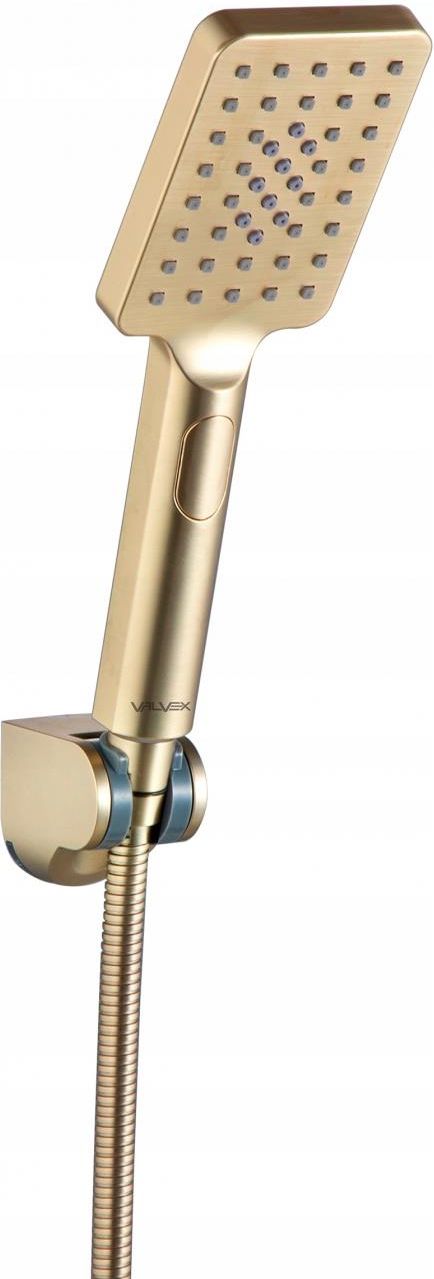 Zestaw natryskowy punktowy, 3-funkcyjny Valvex LOFT 2432860 złoto szczotkowane Produkt: zestaw prysznicowy Kolor: złoto szczotkowane Liczba funkcji: 3 Rodzaj strumieni: deszcz, masaż, mgiełka Długość rączki prysznicowej [mm]: 278 Wąż: stalowy Długość węża [mm]: 1500 Maksymalna temperatura [ºC]: 90 Materiał: tworzywo ABS + stal + mosiądz Regulowany uchwyt punktowy Magic Click! - zmiana rodzaju strumienia za pomocą przycisku Easy Clean - system zapobiegający osadom z kamienia