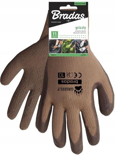 RWG10 Rękawice ochronne GRIZZLY lateks, rozmiar 10 blister Rękawice powlekane lateksem piankowym. Wykonane z dzianiny bawełnianej - ścieg 13. Wysoka odporność na przecięcia i rozdarcia. Ocieplane. Rozmiar: 10