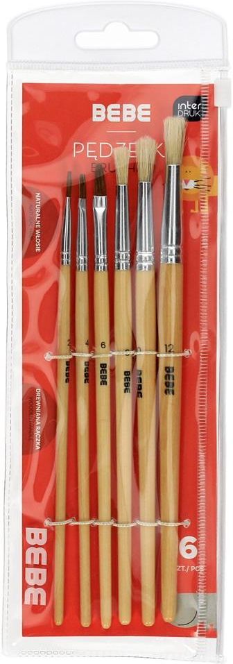 Zestaw pędzelków szkolnych BB Kids marki Interdruk. Rodzaj włosia: naturalne 6 rozmiarów (2 pędzle płaskie + 4 pędzle okrągłe) Rozmiary: 2, 4, 6, 8, 10, 12 Trzonek pędzli wykonany z drewna Pędzelki uniwersalne w zastosowaniu Pędzelki zapakowane w praktyczne etui z zamknięciem strunowym Ilość: 6 szt.