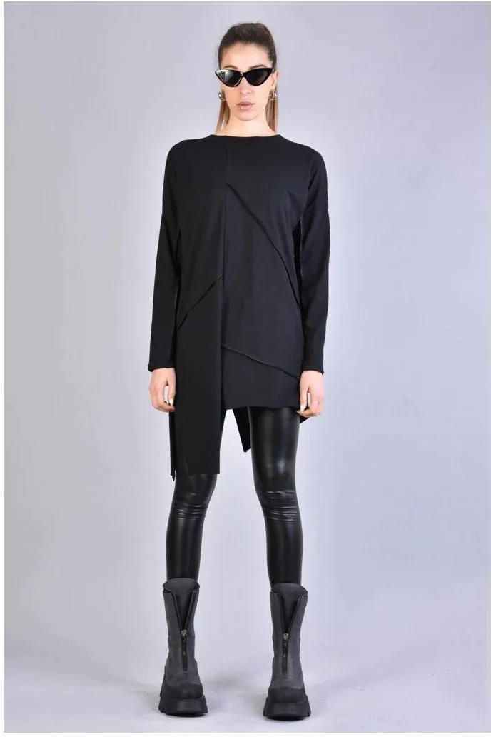 Prosty, dłuższy fason Z okrągłym dekoltem Ozdobiony zewnętrznymi szwami Z asymetrycznym dołem Z rozcięciem z lewej strony Wykonany z wysokogatunkowej tkaniny Wyprodukowano we Włoszech
