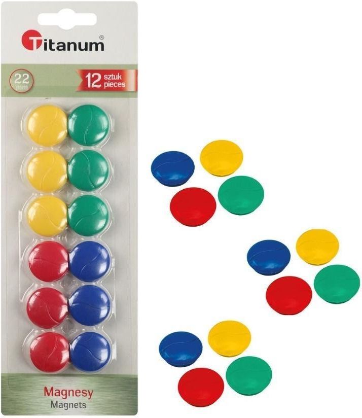 Magnesy do tablic o średnicy 22 mm - zestaw 12 szt. Prezentowany zestaw magnesów do tablic magnetycznych składa się z 12 sztuk o średnicy 22 mm. Magnesy są okrągłe, wykonane z trwałego materiału, a ich zaletą jest łatwość i wygoda użytkowania.Kolorowe magnesy występują w czterech żywych kolorach: żółtym, czerwonym, niebieskim i zielonym. Mnogość kolorów sprawia, że prezentowany zestaw będzie idealny dla dzieci do nauki, dla nauczycieli w pracy czy dla osób poszukujących praktycznego i estetycznego dodatku do swojego miejsca pracy.Poza funkcją użytkową, barwne magnesy z tego zestawu mogą pełnić również funkcję estetyczną, umożliwiając twórcze i kolorowe aranżacje materiałów na tablicy magnetycznej.Kupując zestaw magnesów do tablicy Titanum, zyskujesz nie tylko praktyczny i funkcjonalny produkt, ale również przydatny i doskonale wykonany dodatek, który sprawdzi się zarówno w pracy, jak i w domowym zaciszu. EAN: 5907437606216