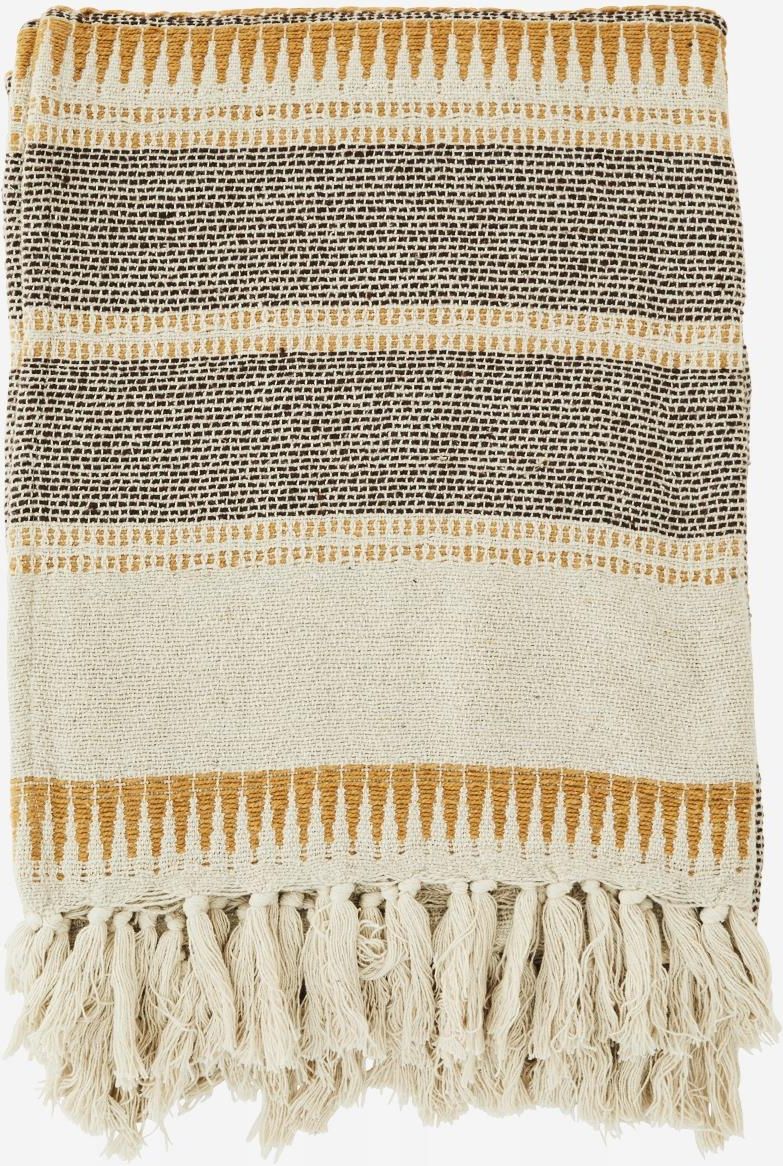 Marka Madam Stoltz reprezentuje projekty inspirowane naturą, lokalnymi tradycjami i kunsztem. Jej asortyment zaczyna się od tekstyliów, po meble, lampy i praktyczne akcesoria. Tkany pled w paski z chwostami to kolejna propozycja od marki Madam Stoltz. Materiały, z których wykonano narzutę pochodzą z recyklingu z zużytych ubrań. Materiały: 65% bawełna, 35% inne włókna.