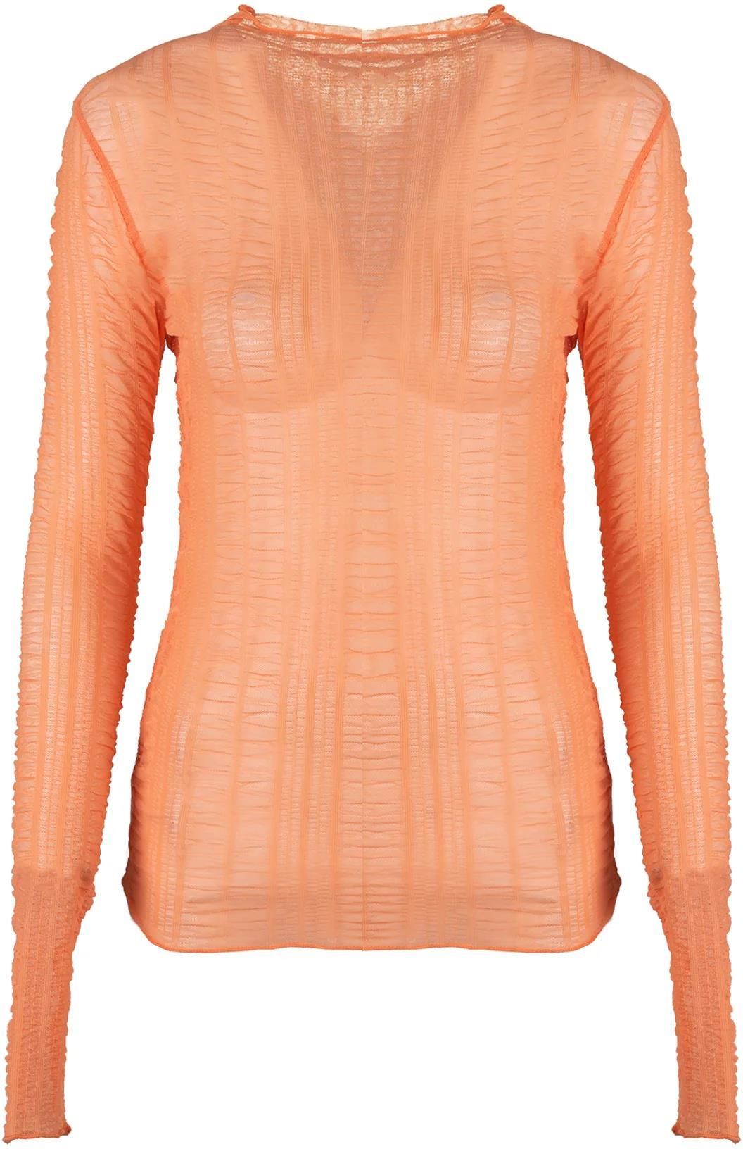 Z okrągłym dekoltem, który subtelnie podkreśla szyję, dodając elegancji i klasy, ta bluzka staje się idealnym wyborem zarówno na co dzień, jak i na wyjątkowe okazje, łącząc w sobie styl i wygodę. Dopasowany fason podkreśla kobiecą sylwetkę, zapewniając jednocześnie komfort noszenia i swobodę ruchów, dzięki czemu poczujesz się pewnie i zjawiskowo w każdej sytuacji. Bluzka typu mgiełka to idealna propozycja na letnie dni, kiedy chcesz czuć się lekko i świeżo, ale jednocześnie wyglądać modnie i stylowo, podkreślając swoją indywidualność. Na karku firmowy detal dodaje wyjątkowego charakteru i podkreśla dbałość o szczegóły, tworząc unikalny akcent, który wyróżnia tę bluzkę spośród innych. Wykonana z wysokiej jakości transparentnego, karbowanego materiału, który delikatnie opływa ciało, zapewniając nie tylko niepowtarzalny wygląd, ale także przyjemne doznania podczas noszenia.