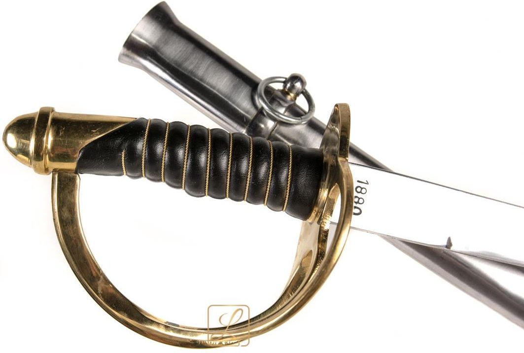 Duża, solidna szabla kawalerii francuskiej z 1880 roku, w komplecie z pochwą.Rękojeść dwu-kabłąkowa z polerowanego mosiądzu, trzon rękojeści obciągnięty czarną skórą opleciony mosiężnym drutem. Ostrze profilowane wykonane z wysokiej jakości stali z wybitą datą 1880. Pięknie wykonana szabla, polecam uwadze!Wymiary: długość całkowita 110 cm długość ostrza 84 cm długość rękojeści 16,5 cm szerokość ostrza max. 34 mm waga 2 kg Idealny prezent dla faceta , prezent dla kolegi odchodzącego z pracy.Możliwość wykonania dedykacji na klindze. Replika szabli nieostrzona, wiernie odzwierciedla oryginał, jednak nie posiada jakichkolwiek cech użytkowych (w rozumieniu ustawy o broni i amunicji z dnia 21 maja 1999 r - Dz.U. z 2012 poz. 576 wraz z późniejszymi zmianami).