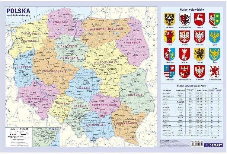 Podkładka na biurko Polska podział administracyjny DEMART ✅ ✔️ Na mapie Polski w skali 1 : 1 750 000 przedstawiono podział administracyjny Polski. Różnymi kolorami zostały wyróżnione obszary 16 województw, a w ich obrębie zaznaczono granice powiatów. Większym fontem podpisano siedziby władz …