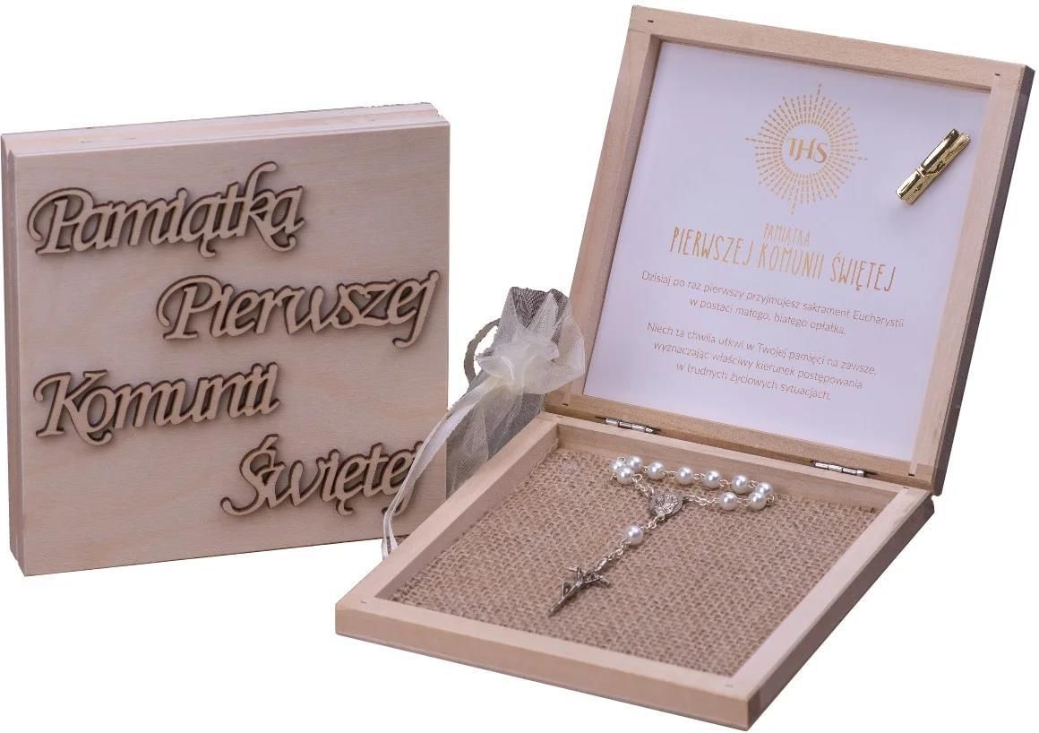 Eleganckie pudełko prezentowe z okazji Pierwszej Komunii Świętej. Pudełko wykonane z naturalnego drewna, udekorowanego od wewnętrznej strony ozdobną karteczką z życzeniami i klamerką do zawieszenia pięniedzy. Wewnątrz pudełka znajduje się dziesiątka różańca świętego. Różaniec wykonany jest z paciorków w kształcie kuleczek, w pięknym, białym odcieniu. Średnica koralików wynosi ok. 5 mm, a poszczególne paciorki połączone są drutem. Dodatkowymi elementami różańca są medalik z wizerunkiem Matki Boskiej oraz krzyżyk. Różaniec dostarczany jest w ozdobnym woreczku.