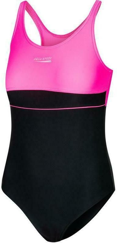 Kostium kąpielowy dziewczęcy na basen EMILY Aqua-Speed r. 152 czarno-różowy Kostium Emily to doskonała propozycja dla dziewczynek i młodzieży dostępny w wielu modnych zestawieniach kolorystycznych. Kostium ten doskonale nadaje się na basen i na plażę, wykonany jest z przyjemnej w dotyku dzianiny Malaga i posiada podszewkę na biuście oraz wycięciem w kształcie migdała na plecach. Wykonanie materiał: Malaga (80% Poliamid 20% Elastan) technologia: kostium wykonano z mieszanki elastycznych tkanin, które odpowiadają za idealne dopasowanie do sylwetki odporność na promieniowanie UV: tak odporność na chlor: tak