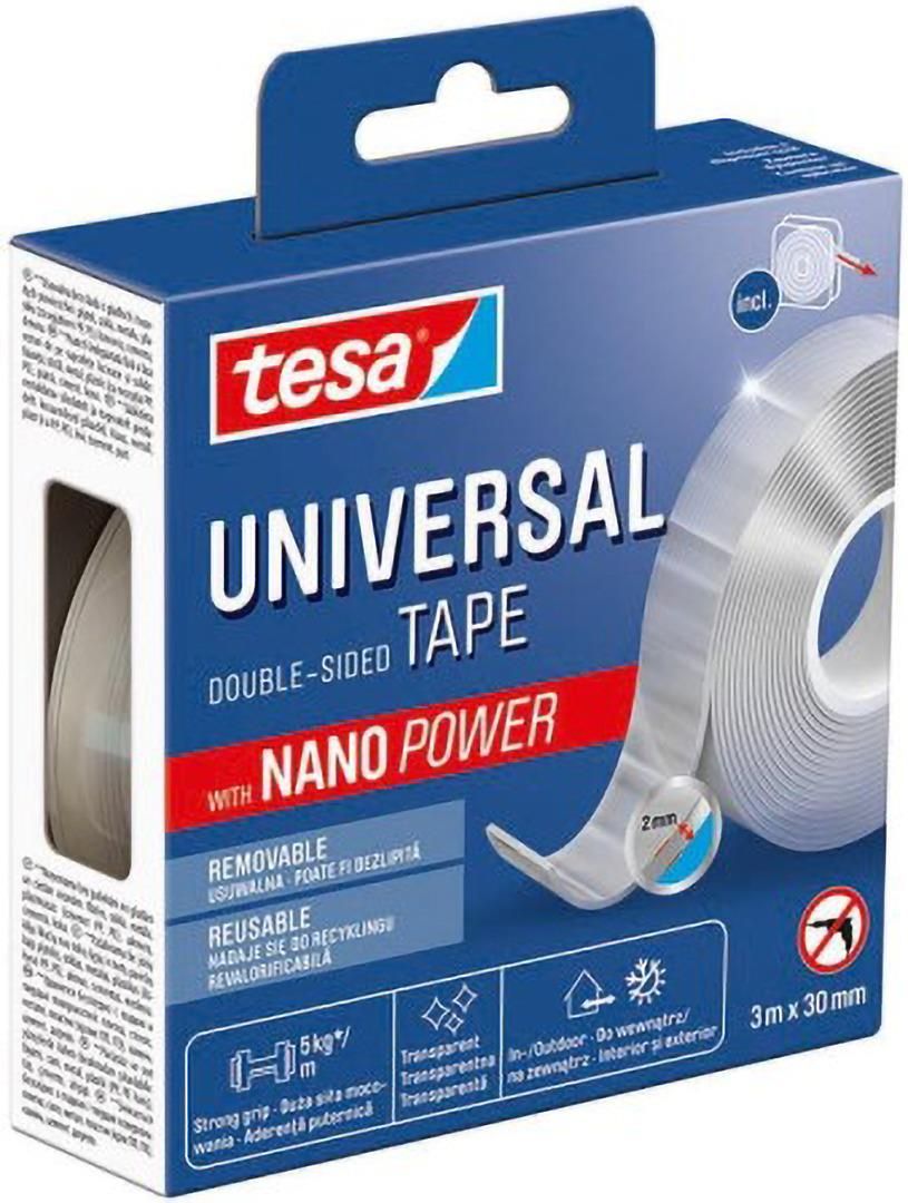 TESA Dwustronna taśma montażowa z Nano Power 3m x 30mm transparentna EAN: 4063565404009 Dwustronna taśma montażowa TESA Nano Power to uniwersalne rozwiązanie do mocowania, dekorowania i organizowania przestrzeni zarówno wewnątrz, jak i na zewnątrz pomieszczeń. Dzięki zaawansowanej technologii Nano Power taśma zapewnia wyjątkową siłę wiązania, umożliwiając stabilne mocowanie różnych przedmiotów na twardych i gładkich powierzchniach. Jedną z kluczowych zalet tego produktu jest możliwość wielokrotnego użytku. Taśma może być z łatwością usunięta, umyta i ponownie użyta, bez pozostawiania śladów czy uszkodzenia powierzchni. Jej przezroczysta struktura sprawia, że jest niemal niewidoczna, co pozwala na dyskretne mocowanie dekoracji i innych elementów. Taśma TESA Nano Power to doskonała alternatywa dla tradycyjnych metod mocowania, takich jak gwoździe, śruby czy magnesy. Wytrzymuje obciążenia do 5 kg na metr taśmy, zapewniając trwałość i niezawodność na długi czas. Poręczny dyspenser umożliwia szybkie i wygodne aplikowanie taśmy, co dodatkowo zwiększa komfort użytkowania. Sprawdzi się w domu, biurze, warsztacie czy podróży – zawsze gotowa do użycia, gdy potrzebne jest szybkie i solidne mocowanie. Zamów już teraz i ciesz się wygodnym rozwiązaniem bez konieczności wiercenia czy przybijania gwoździ! Zalety taśmy montażowej Nano Power marki TESA Technologia Nano Power – wysoka siła wiązania Możliwość wielokrotnego użytku – łatwe usuwanie i ponowne przyklejanie Nie pozostawia śladów na gładkich i twardych powierzchniach Nadaje się do zastosowań wewnętrznych i zewnętrznych Przezroczysta struktura – niemal niewidoczne mocowanie Udźwig do 5 kg na metr taśmy Praktyczny dyspenser ułatwiający aplikację i przechowywanie Alternatywa dla gwoździ i magnesów – bez uszkadzania powierzchni Dane techniczne taśmy montażowej Nano Power marki TESA Kolor: przezroczysty Wymiary: 3m x 30mm Zawartość opakowania: 1 rolka Siła udźwigu: 5 KG/M