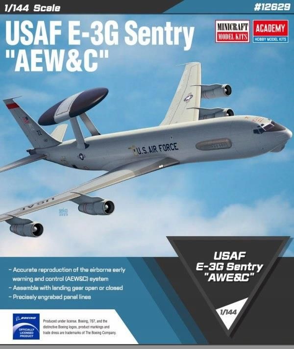 Boeing E-3G Sentry AWACS - USAF Service ACADEMY - nr. 12629 - scale 1/144 Amerykański samolot wczesnego ostrzegania Boeing E-3G Sentry do sklejania i pomalowania z firmy Academy nr katalogowy 12629. Model posiada m.in.: 3 schematy malowania i oznakowania, kalkomanie, część z przezroczystego …