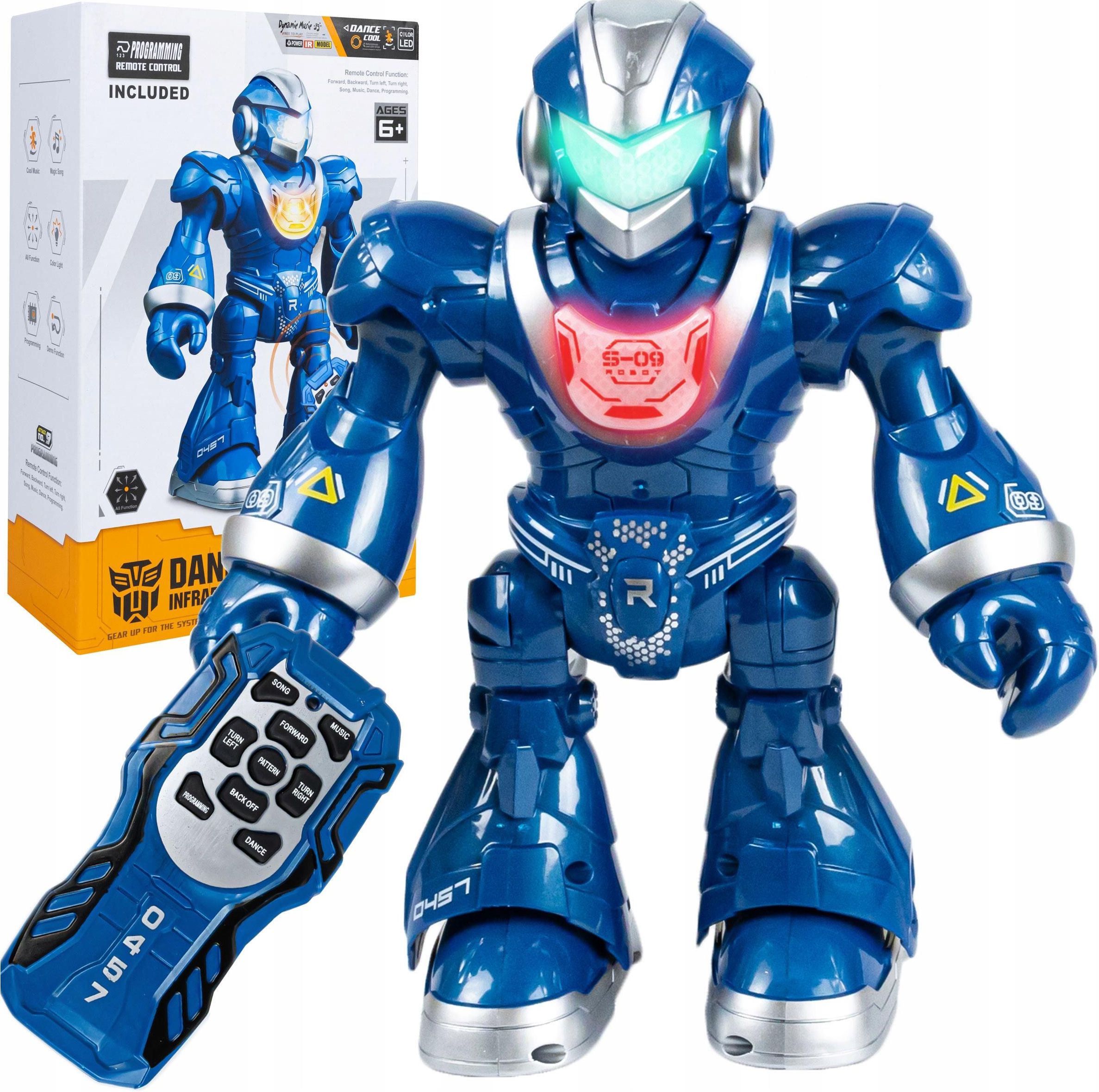 INTERAKTYWNY TAŃCZĄCY ROBOT ZDALNIE STEROWANY +PROGRAMOWANIE DLA DZIECI LED TAŃCZĄCY ROBOT ZDALNIE STEROWANY RC Z FUNKCJĄ PROGRAMOWANIA! W pełni profesjonalna zabawka, tańczący robot rc! Robot wykonany jest z najwyższą starannością, z najwyższej jakości materiałów i podzespołów. To coś więcej niż tylko świetna zabawka – to programowalny, autonomiczny kompan Twojego dziecka. Najwyższa jakość wykonania i wykończenia oraz ogrom możliwości sprawia, że przeniesiesz swoje dziecko na zupełnie nowy wymiar zabawy. Robot ma całą paletę możliwych ruchów i funkcji np. tryb PROGRAM pozwala stworzyć własną sekwencję ruchów! Robot dostępny w dwóch kolorach czerwony niebieski W wiadomości dla Sprzedającego podaj wybrany kolor. W przypadku braku informacji spakujemy niebieski. Najważniejsze cechy Wysoka jakość wykonania Porusza się w każdym kierunku Ruchome ręce - manualnie Tańczy Śpiewa w języku angielskim Obraca się Kompaktowe wymiary, możesz zabrać zabawkę gdzie tylko chcesz Tryb programowania pozwala na zapamiętanie wybranych przez dziecko różnych czynności, które potem wykona Twój robot. Dowolnie zaprogramowane czynności to tysiące możliwych kombinacji – taka różnorodność sprawia, że nie ma szans na nudę. Oprócz tego wyposażony jest w efekty świetlne. Klatka piersiowa robota jest podświetlana na przemian czerwonym i niebieskim kolorem. Podczas ruchu robota świecą się także jego oczy kolorem niebieskim. Robot może być zabawnym imprezowiczem i wykonywaćoryginalny taniec robotów lub śpiewać. Robot jest w pełni sterowalny, wykonuje ruchy, które wzorowane są na ruchach człowieka. Robot precyzyjnie wykona rozkazy swojego dowódcy. Sterowanie jest bardzo proste! Odbywa się z pomocą intuicyjnego pilota. Jego przyciski są opisane aby ułatwić obsługę. Zabawka oraz pilot zasilane są bateriami typu AA 1,5V (brak w zestawie). Futurystyczny zdalnie sterowany robot wielofunkcyjny z możliwością programowania to gwarancja rewelacyjnej, wielogodzinnej frajdy dla Twojego dziecka, ale też dla Ciebie. Najważniejsze cechy Wiek: 6+ Sterowanie: intuicyjny pilot Efekty świetlne i dźwiękowe: Tak Tryb programowania: Tak Zasilanie robota: 3x AA (brak w zestawie) Zasilanie pilota: 2x AA (brak w zestawie) Wymiary robota: 23.2 x 19.1 x 9 cm Wymiary opakowania: 27 x 18.5 x 9.5 cm W skład zestawu wchodzi Tańczący robot RC Pilot sterowania Elementy zestawu nie posiadają żadnych ostrych krawędzi, są w pełni bezpieczne. Całość zapakowana w oryginalne opakowanie producenta - Idealnie nadaje się na prezent!