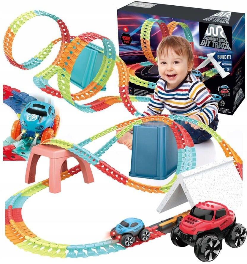 Elastyczny Tor Samochodowy + Autko - Rozwijająca Zabawa dla Małych Konstruktorów W zestawie znajduje się 192 elementy toru, z których można zbudować trasę o długości 4,80m. Specjalnie zaprojektowana konstrukcja jest elastyczna, pozwalając autku na ekscytującą jazdę w pętlach, nachyleniach, spiralach i zakrętach. Elementy toru są elastyczne, co pozwala na tworzenie różnorodnych tras. Wspólnie możecie wymyślać konfiguracje z spirali, nachyleń, podjazdów i innych przeszkód, które staną na drodze autka. To nieskończona kreatywność i zabawa! Zabawa i Rozwój Ekscytująca zabawa zbudowanym torze wciąga dzieci na długie godziny, rozwijając ich zdolności manualne i kreatywność. Podczas wyścigów i przeszkód, dzieci uczą się współpracy, logicznego myślenia i wytrwałości. Autko LED + Wymienna Kabina Do zestawu zostało dołączone świecące autko zasilane bateriami, które posiada wymienną kabinę w kolorze czerwonym i niebieskim. Dzieci mogą organizować rajdy, zmieniając kabinę i zachwycając się światłem podczas zabawy. Specyfikacja i wymiary Materiał: Tworzywo sztuczne Kolor: Wielokolorowe Elementy toru: 192 Wszystkich elementów: 196 Auto zasilane na baterie: Tak (3 x AAA, brak w zestawie) Obudowa auta: 2 szt. (Czerwona, niebieska) Długość toru: 480 cm Wymiar autka: 10x7,5x7 cm Zestaw Pełen Możliwości: Wyścig do Świata Kreatywności i Wyobraźni Tor samochodowy zapewni dziecku wiele godzin świetnej zabawy. Elementy toru, dzięki swojej dużej elastyczności, można go przekładać, obracać, podnosić, zmieniać kierunek jazdy i układać w dowolne kombinacje. Każdy element toru jest wypinany, więc łatwo się go składa i rozkłada. Dziecko podczas zabawy rozwija zdolności manualne, konstrukcyjne oraz kreatywność. Wyścig rozpoczynamy od specjalnie zaprojektowanego punktu startowego. Po jego umieszczeniu na odpowiednim miejscu, auto zaczyna swoją jazdę, pewnie trzymając się toru, niezależnie od zakrętów czy wzniesień. Prezent, Który Buduje Zdolności: Zabawa i Nauka w Jednym! Składanie elementów torów, ich rozkładanie i składanie na nowo to doskonały trening dla rąk dziecka. Tor samochodowy wspiera rozwój zdolności manualnych oraz zdolności konstrukcyjnych. Zabawka jest kolorowa, więc pobudza również wyobraźnię, a także rozwija dziecięcą kreatywność, gdyż można z niej stworzyć dowolne konstrukcje torów. Tor można wykorzystać również do nauki – poznawanie znaków drogowych, rozpoznawanie kolorów, a nawet liczenie, ile elementów układanki przejechał samochodzik. Zestaw idealniesprawdzisię jako prezent na Mikołajki, święta, Gwiazdkę czy urodziny. Dziecko pokocha tę dynamiczną i twórczą zabawę z autkiem na elastycznym torze!