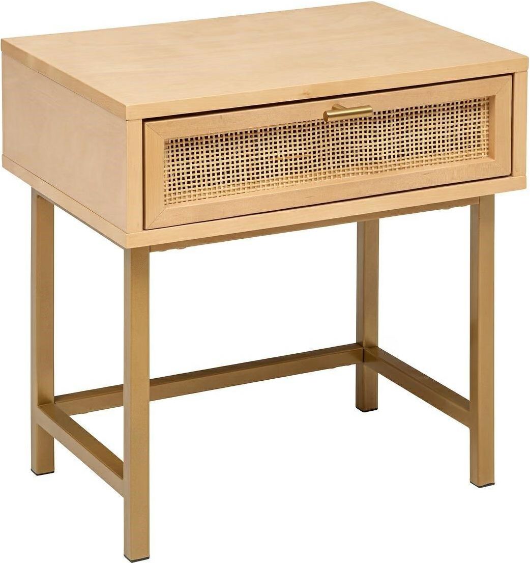 Szafka nocna Rayo boho z rattanowymi frontami i złotą podstawą marki Atmosphera to propozycja dla osób ceniących naturalne materiały, lekki design i unikalny styl. Mebel o szerokości 45 cm, wykonany z połączenia drewna, rattanu i metalu, został zaprojektowany z myślą o funkcjonalności w nowoczesnej sypialni. Praktyczna szuflada oraz dekoracyjne, rattanowe fronty sprawiają, że ta szafka nocna nie tylko ułatwia organizację przestrzeni, ale również staje się wyjątkową ozdobą każdego wnętrza. Boho akcent w Twojej sypialni – naturalność i elegancja Szafka nocna Rayo doskonale wpisuje się w popularny styl boho, który łączy swobodę aranżacji z nutą egzotyki. Rattanowy front przyciąga wzrok subtelną plecionką, a złota podstawa dodaje całości wyrafinowanego charakteru, tworząc harmonijny duet natury i elegancji. Ten model świetnie sprawdzi się jako szafka nocna do sypialni – zarówno w aranżacjach stawiających na jasne, neutralne barwy, jak i w bardziej eklektycznych wnętrzach. Funkcjonalność na co dzień – praktyczna szuflada i kompaktowy rozmiar Oferując szerokość 45 cm, głębokość 35 cm i wysokość 50 cm, szafka nocna Rayo jest idealna zarówno do większych, jak i mniejszych sypialni. Pojedyncza szuflada pozwala wygodnie przechowywać drobiazgi, które chcesz mieć zawsze pod ręką – książkę, okulary czy ładowarkę. Blat z naturalnym wykończeniem świetnie sprawdzi się jako miejsce na lampkę nocną czy ulubiony kubek z herbatą. Dzięki stabilnej, metalowej podstawie możesz być pewny trwałości i wygodnego użytkowania przez długi czas. Dlaczego warto wybrać szafkę nocną Rayo boho? Rattanowy front – efektowny, naturalny akcent, który ożywia każde wnętrze Złota podstawa – podkreśla elegancki charakter mebla i nadaje mu lekkości Kompaktowa szerokość 45 cm – idealna do sypialni o różnej wielkości Praktyczna szuflada – pozwala utrzymać porządek i łatwo przechowywać najpotrzebniejsze przedmioty Stabilna konstrukcja z drewna, rattanu i metalu – gwarantuje trwałość i odporność na codzienne użytkowanie Szafka nocna, która zmienia klimat wnętrza Decydując się na szafkę nocną Rayo boho z rattanowymi frontami, wybierasz nie tylko praktyczny mebel do sypialni, ale także stylową dekorację, która nada Twojemu wnętrzu przytulności i oryginalności. To propozycja dla miłośników naturalnych trendów, którzy chcą wprowadzić do swojej przestrzeni elementy inspirowane naturą i rękodziełem.