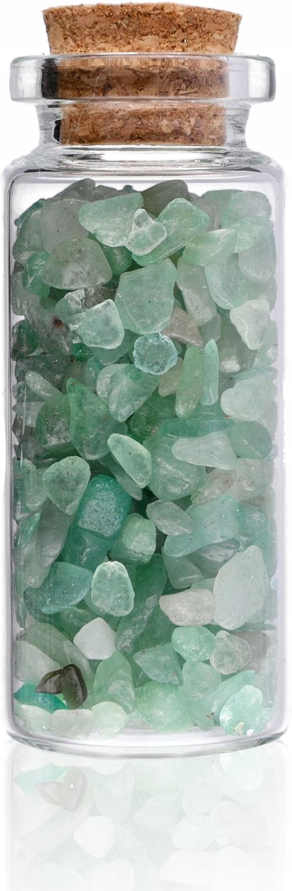 Buteleczka z kamieniami Awenturyn zielony 5 cm Twoja osobista butelka energii Buteleczka z kamieniami naturalnymi to prawdziwa gratka dla miłośników kamieni, natury i estetyki. Wybierz kamienie, które przyciągną do Twojego życia to, czego najbardziej potrzebujesz. Buteleczka z kamieniami naturalnymi stanie się w ten sposób osobistym narzędziem do pracy z energią, które zawsze masz pod ręką. Słoiczek z kamieniami Informacje Wymiary: około 52 x 20 mm Słoiczek: szkło, korek Kamień: naturalny AWENTURYN oraz domieszki innych minerałów Kolor kamienia: odcienie zieleni Cena dotyczy 1 sztuki. Każda buteleczka jest inna, ze względu na zawartość kamienia naturalnego. Zdjęcia przedstawiają przykładowe buteleczki. Buteleczkę wysyłamy losowo. Moc w małej formie Buteleczka jest niezwykle poręczna i można ją zabrać wszędzie – zmieści się w kieszeni czy torebce. Dzięki wyjmowanemu korkowi możesz otworzyć buteleczkę. Doskonale sprawdzi się jako ozdoba na biurku, półce czy przy łóżku, zwłaszcza w zestawieniu po kilka buteleczek. Przezroczyste szkło pozwala na podziwianie różnorodnych barw i kształtów kamieni, które wypełniają wnętrze buteleczki. Idealna do kolekcji minerałów lub jako narzędzie edukacyjne. Piękno minerałów przyciąga wzrok, a jednocześnie wnosi do wnętrza odrobinę magii natury. Awenturyn zielony ✨ Kamień szczęścia Klasyczny kamień szczęścia. Zielony awenturyn zapewnia siłę, pewność siebie, odwagę i szczęście. Przywraca optymizm na całe życie i popycha nas do podjęcia działań, aby zdobyć to, czego pragniemy najbardziej. Minerał ma kojącą energię. Jego silne połączenie z Ziemią pomaga pogłębić nasze połączenie z naturą, co w zamian stymuluje przebudzenie naszych zdolności psychicznych, zdrowia i siły. Zielony awenturyn nazywany jest także „kamieniem możliwości”. Uważany jest za najszczęśliwszy ze wszystkich kryształów, przynoszący szczęście w wielu różnych formach, niezależnie od tego, czy jest to szczęście finansowe, szczęście w związkach, czy po prostu szczęście we wszystkim, co się robi