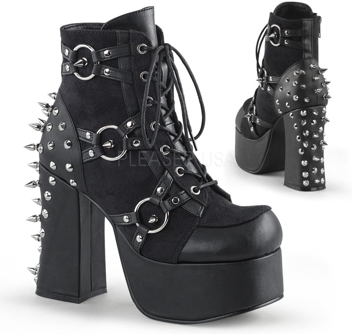 Botki CHARADE-100 to obuwie naprawdę wyjątkowe i przeznaczone dla ekskluzywnej klienteli. Ich wyrazisty styl nawiązuje do inspiracji punkowych, rockowych i wszelkich ostrych brzmień. Doskonale podkreślają styl każdej męskiej i żeńskiej Divy, która nie boi się mocnych brzmień, odważnego wyrażania swojej osobowości lub po prostu chcę wyróżnić się z tłumu. Ostre, metalowe kolce z tyłu buta doskonale współgrają z również metalowymi, okrągłymi klamrami na boku oraz sznurowadłami z przodu. Dzięki temu, że buty są wiązane, są bardzo stabilne, zatem pomimo dość wysokiego obcasa 11,4 cm (w tym platforma 5,1 cm) pozwalają na wygodne i bezpieczne poruszanie się, taniec i wszelkie aktywności.Czarne, sznurowane botki CHARADE-100 z kolcami i klamrami wykonane są ze skóry wegańskiej i dostępne w rozmiarach od 36 do 42. Doskonale będą współgrać ze stylem rockowym, punkowym, ostrzejszymi stylizacjami z lateksu i skóry oraz wszelkimi przebraniami do alternatywnych pokazów, filmów, sesji zdjęciowych i zabaw. Te wyjątkowe buty podkreślają Twój zadziorny charakter i zdecydowaną osobowość!