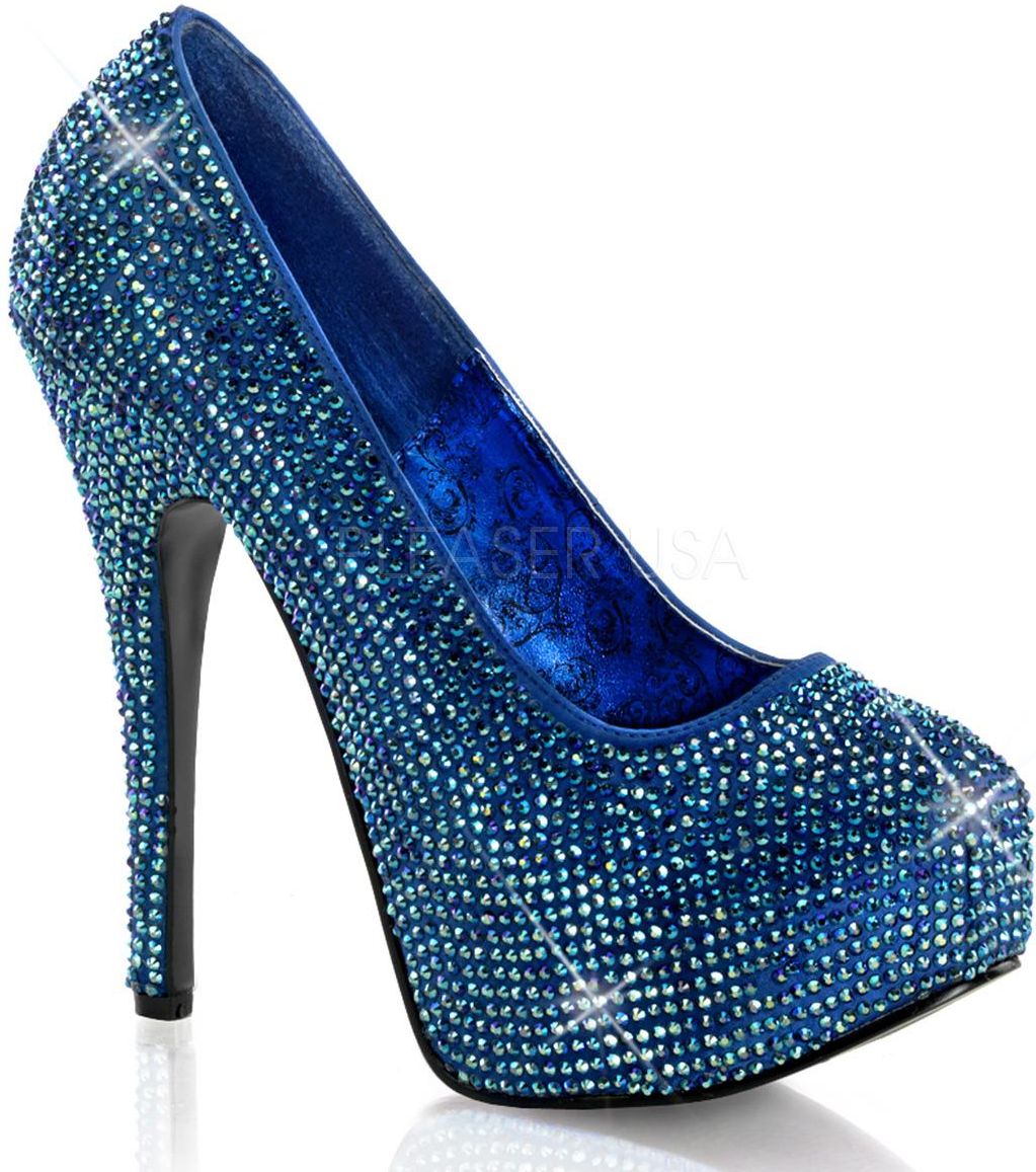 Niezwykłe szpilki TEEZE intensywnym i modnym w kolorze niebieskim z wyjątkowymi, lśniącymi kryształkami to propozycja tak samo klasyczna, jak szalona. Choć model nawiązuje do spokojnych, biurowych czółenek, wykonanie w niczym nie przypomina nudnego obuwia! Wszystko to dzięki 14,6-centymetrowym obcasem oraz 4,5-centymetrowej, ukrytej platformie. Taka wysokość obuwia sprawia, że nogi właścicielki są optycznie bardzo wydłużone, zaś platforma - dzięki swojej stabilności - pozwala na pewniejsze poruszanie się i bezpieczeństwo stopy podczas tańca i innych aktywności. Wyjątkowe, odbijające światło kryształki na całej powierzchni niebieskich szpilek TEEZE sprawiają, że buty te fantastycznie odbijają światło. Tym samym idealnie sprawdzą się w gorące, dyskotekowe wieczory z dużą ilością świateł, odbiciami świetlnych kul i innych efektami specjalnymi, które podkreślają wyjątkowość buta i jego właścicielki przy każdym ruchu. Te niezwykłe buty TEEZE w kolorze niebieskim z kryształkami dostępne są w rozmiarach od 36 do 42.