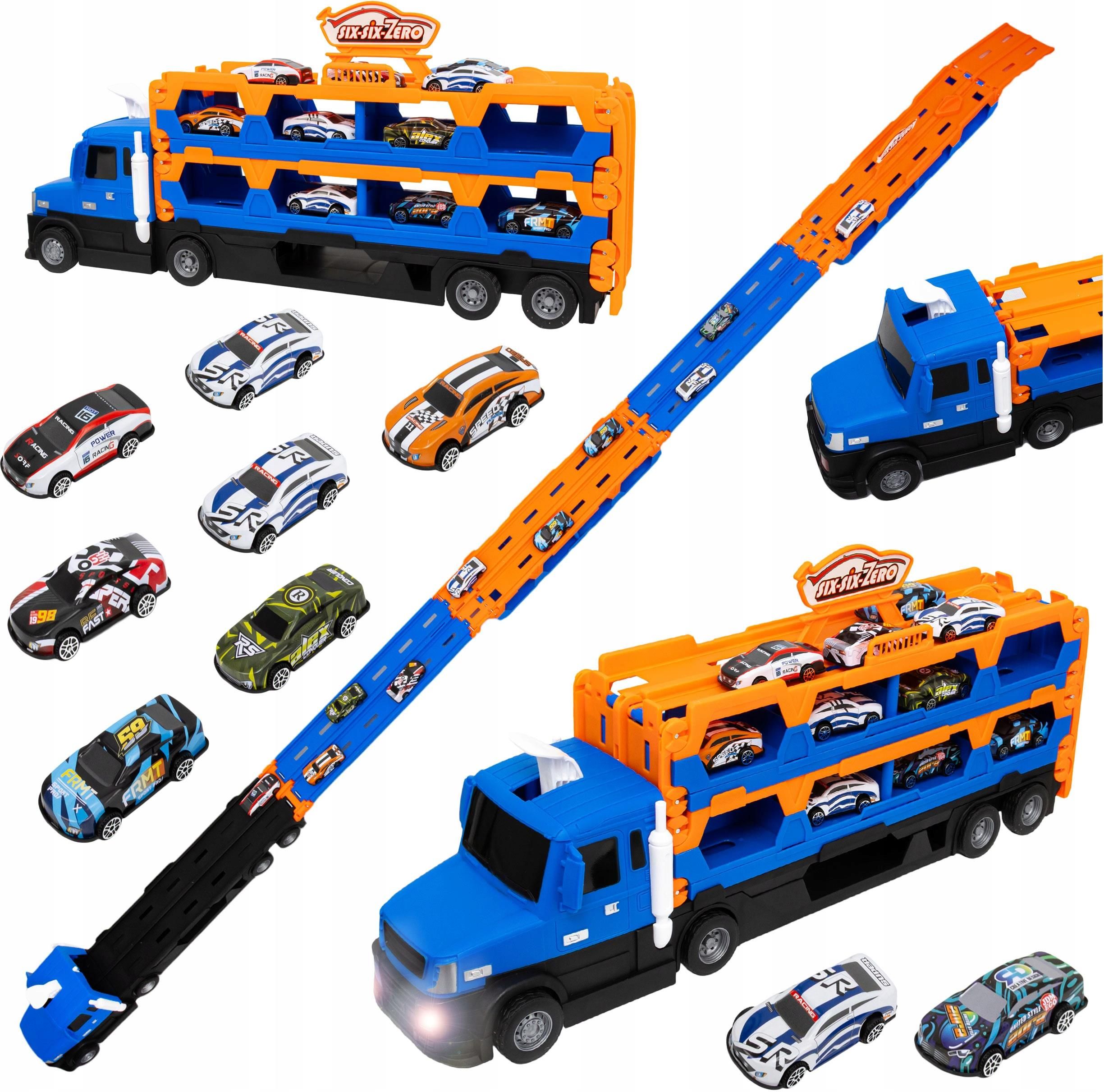 WYRZUTNIA AUTEK DLA DZIECI TOR ZJEŻDŻALNIA LAWETA 211CM DŹWIĘK LED RESORAKI CIĘŻARÓWKA Z AUTAMI, AŻ 10 POJAZDÓW Z WYRZUTNIĄ - MEGA ZESTAW! Taki zestaw to spełnienie marzeń każdego chłopca! Połącz zabawę z rozwojem :) Przedstawiony model wspiera kreatywność, stymuluje zmysł wzroku a także rozwój motoryki Twojego dziecka. Najważniejsze cechy Wysoka jakość wykonania 3w1; auto, laweta, wyrzutnia w jednym! Kolorowe resoraki w zestawie, aż 10szt Efekty dźwiękowe oraz świetlne Idealne na prezent! Aż 10 różnych sportowych resoraków, świetnie przemyślana konstrukcja pozwoli na uporządkowanie pojazdów. Teraz wszystkie będą pod ręką, w naczepie Twojego auta ciężarowego! Ciężarówka podczas zabawy pełni aż 3 funkcje, pojazdu, parkingu oraz wyrzutni. Teraz możesz być także kaskaderem To prawdziwy hit! Pojazd posiada efekty świetlne oraz dźwiękowe, wystarczy nacisnąć przednią maskę aby usłyszeć dźwięk szybkiej jazdy oraz ujrzeć migające kolorami reflektory, maluch będzie zachwycony! Tir to także wystrzałowa wyrzutnia! Wystarczy rozłożyć lawetę po długości, ustawić auta i uderzyć w przycisk strzału. Im mocniej uderzysz w przycisk tym dalej pojadą auta. Podczas jego naciśnięcia ciężarówka wyda dźwięki szybkiej jazdy, a reflektory zaświecą się. Długość toru do jazdy to aż 198cm! Rozłożenie go jest banalnie proste, także dla najmłodszych. Frajda z zabawy nie tylko dla dzieci! Laweta jest składana, dzięki temu możesz zabrać zestaw gdzie tylko chcesz. Zaparkuj pojazd i baw się ! Całość wykonana z wysokiej jakości tworzywa sztucznego, zapakowana w kolorowe pudełko – idealne na prezent! Specyfikacja Wiek: 3+ Efekty świetlne: Tak, reflektory Efekty dźwiękowe: Tak, szybka jazda Zasilanie pojazdu: baterie 2x AA 1,5V Wymiary rozłożonego auta z trasą do jazdy: 211 x 5,5 x 12cm (dł x wys. x szer.) Wymiary złożonej ciężarówki: 51 x 17 x 12 (dł x wys. x szer.) + rączka 5cm Wymiary resoraków: ok 6,5 x 3 x 2,5cm ( dl. x szer. x wys.) Wymiary opakowania: 51 x 18 x 12,5cm (dł. x wys. x szer.) Waga produktu z opakowaniem: 1.222kg Rączka jest wyjmowana, do samodzielnego umieszczenia. Auta w losowych kolorach Skład zestawu Ciężarówka z funkcją wyrzutni oraz lawety 10 pojazdów Kolorowe pudełko idealne na prezent