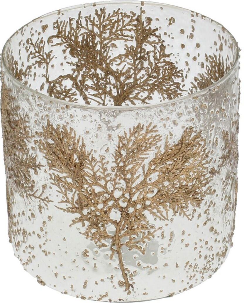 Świecznik szklany w złote gałązki. Świecznik świąteczny ze szkła w otoczeniu gałązek brokatowych to efektowna ozdoba, która wnosi do wnętrza wyjątkowy urok i magiczną atmosferę świąt. Jego delikatne półprzezroczyste szkło nadaje mu subtelności, a zarazem sprawia, że światło świecy, rozprasza się w sposób niezwykle uroczy i łagodny. Ozdobą świecznika są gałązki brokatowe. Te migoczące elementy dodają mu blasku i elegancji, a ich delikatny błysk przypomina nam o magicznej aurze świąt Bożego Narodzenia. Kiedy zapalasz świecę w świeczniku Twig, całe wnętrze wypełnia się ciepłem i blaskiem. Sprawdź nasze inne propozycje na świąteczne świeczniki!Wymiary: śr. 15 cm, wys. 15 cm.