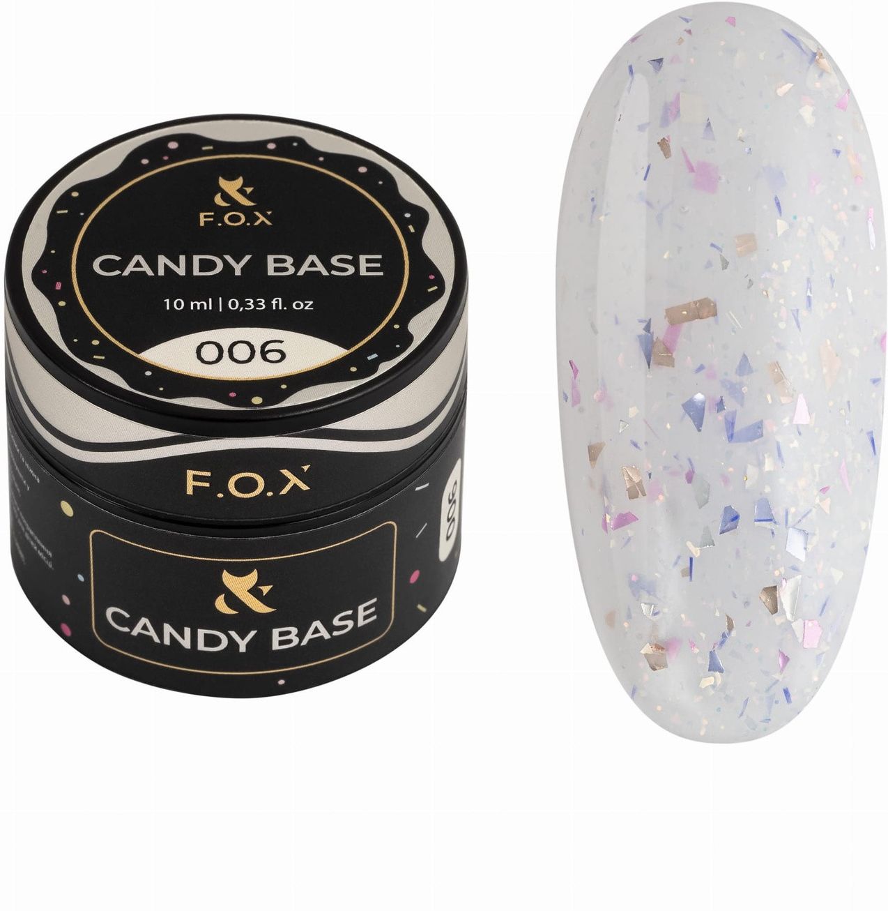 F.O.X Candy Base - najnowsza wiosenna kolekcja kolorowych baz w subtelnych półprzezroczystych odcieniach z dodatkiem różnorodnych i kolorowych cząsteczek folii i brokatu. Candy Base to idealny sposób na nadanie paznokciom subtelnego blasku i wyjątkowego charakteru. Mnóstwo mieniących się drobinek w różnych kolorach i kształtach pozwala na stworzenie niepowtarzalnych stylizacji, które zachwycą każdego. Folia nie opada, równomiernie rozprowadza się w bazie, jest cienka i elastyczna, dlatego nie przeszkadza w pracy. Baza ma średnio gęstą konsystencję, łatwo się poziomuje, ukrywa niedoskonałości płytki. Nadaje się do wzmocnienia i utrzymania kształtu oraz krawędzi miękkich paznokci, bez efektu kurczenia się. *Zalecamy aplikację F.O.X Candy Base na paznokieć pokryty cienką warstwą elastycznej bazy w charakterze podkładu. Zalety: ⠀ Subtelne pastelowe odcienie Średnio twarda Nadaje się do wzmocnienia Średnio gęsta konsystencja Aplikacja: Nadaj paznokciom odpowiedni kształt, zmatuj płytkę Zastosuj preparat F.O.X Nail Prep Zastosuj preparat F.O.X Ultrabond non-acid Całą powierzchnię paznokcia pokryj cienką warstwą elastycznej bazy F.O.X i utwardź, następnie F.O.X Candy Base; jeśli zachodzi konieczność wzmocnienia i wyrównania, zastosuj metodę kropelkową Utwardź w lampie UV 36W - 2 min; w lampie LED/UV 48W - 30-60 s. Zakończ stylizację aplikacją i polimeryzacją wybranego topu z oferty F.O.X Pojemność: 10 ml