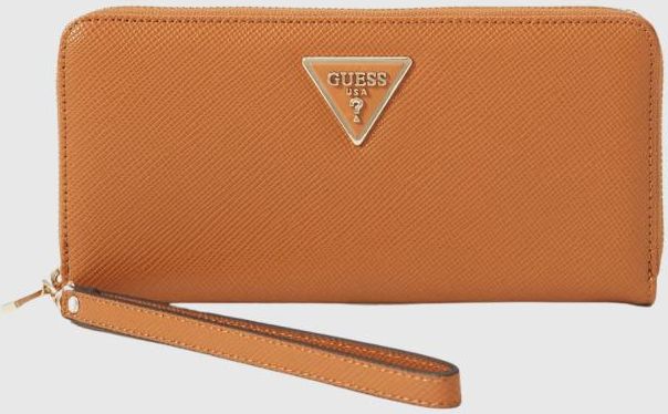 Brązowy damski portfel ze skóry ekologicznej marki Guess. Zamykany na zamek, wewnątrz zasuwana kieszeń na bilon, dwie przegrody, 12 miejsc na karty, dwie wsuwane kieszenie i dodatkowa kieszeń na zamek z tyłu.