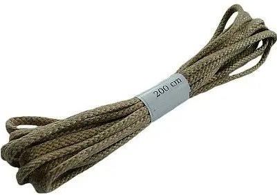 Ciemnobeżowe woskowane bawełniane płaskie sznurówki do butów 200 cm Halan. Sznurówki idealne są do nawlekania przy 20-28 oczkach w cholewce obuwiowej. Szerokość sznurowadeł 5 mm. Produkt polski.