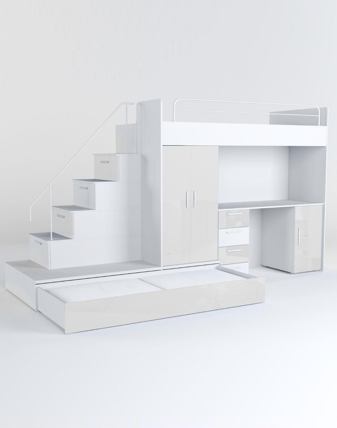 Zestaw Raj 5 to kompleksowe rozwiązanie do pokoju dziecka lub nastolatka.Łączy wygodne miejsce do spania, praktyczne biurko, pojemną szafę oraz bezpieczne schodki z funkcją przechowywania, dodatkowo posiada wygodne siedzisko oraz wysuwany materac.To nie tylko oszczędność miejsca, ale i maksymalne wykorzystanie przestrzeni w atrakcyjnej formie.W skład zestawu wchodzą:- łóżko piętrowe (na górze) ze stelażem i materacem,- biurko z szufladami i szafką (w centralnej części),- pojemną szafę ubraniową,- praktyczne schody z szufladami w stopniach – z możliwością montażu po lewej lub prawej stronie,- wygodne siedzisko,- wysuwane dodatkowe miejsce do spania - rozkładany materac piankowy w dolnej szufladzie ( 75 cm x 180 cm) o grubości 7 cm.Cechy i zalety:- Bezpieczeństwo – barierki na górnym łóżku i przy schodkach.- Wysoka jakość – solidna płyta laminowana i fronty MDF na wysoki połysk.- Modny design – nowoczesne wykończenie w atrakcyjnych kolorach.- Praktyczność – biurko, szafa i schodki z funkcją przechowywania w jednym meblu.- Udźwig górnego łóżka: do 75 kg.- Stelaż łóżka jest wykonany z ramy ze sklejki bukowej dzięki czemu jest on bardzo wytrzymały. Stelaż posiada 21 listew sprężynujących. Raj 5 dostępny jest w 8 modnych wariantach kolorystycznych, szafki są wykończone na wysoki połysk:- biały + fiolet- biały + biały- biały + beż- biały + czarny - biały + szary- biały + niebieski- biały + róż- biały + zielony To doskonały wybór dla chłopca i dziewczynki – praktyczny, nowoczesny i bezpieczny zestaw, który odmieni każdy pokój dziecięcy lub młodzieżowy.Model objęty jest 2 letnią gwarancją producenta.Produkt dostarczymy do Państwa BEZPŁATNIE pod wskazany adres na terenie całego kraju.Mebel wymaga samodzielnego montażu, zgodnie z załączoną instrukcją.Co WAŻNE: zgodnie z prawem i naszymregulaminemmają Państwo pełne prawo do zwrotu nieużywanych towarów, jeśli nie spełnią one Państwa oczekiwań. Wymiary: