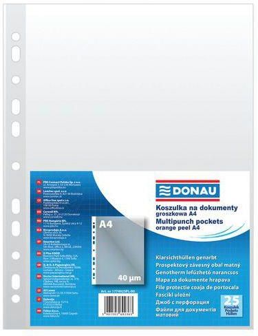 Koszulki na dokumenty groszkowe (A4, 25szt) DONAU. Cechy produktu: - koszulki wykonane z miękkiej, ekologicznej folii polipropylenowej 40µm, - specjalnie wzmocniony brzeg, - groszkowe, przeźroczyste, - otwarte na górze, - antyelektrostatyczne, antyrefleksyjne, - przeznaczone na dokumenty w formacie A4, - ilość dziurek do wpięcia: 11, - koszulek w j.s., - kolor transparentny, - wyprodukowane w fabryce posiadającej certyfikat...