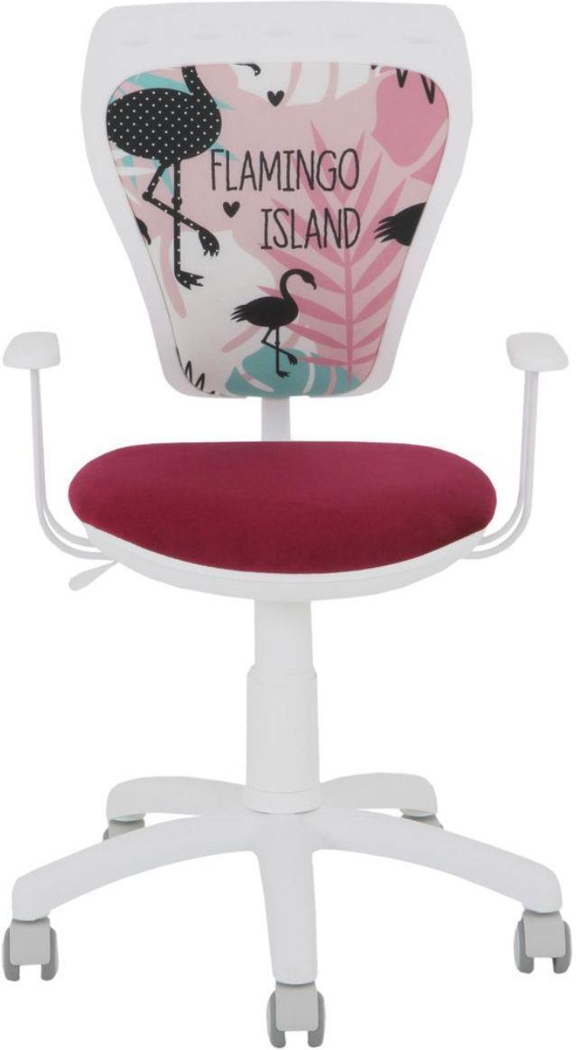 Dziecięce krzesło Ministyle Flamingo Island marki Nowy Styl to produkt dedykowany uczniom, zwłaszcza tym w pierwszych latach szkolnej nauki.Profilowane oparcie tapicerowane jest przyjemną w dotyku tkaniną z nadrukiem przedstawiającym flamingi.Uniwersalna kolorystyka - biały stelaż - pozwala na szereg możliwości aranżacyjnych w pokoju dziecka.Obrotowe siedzisko także pokrywa tkanina zastosowana na oparciu krzesła.Siedzisko tapicerowane miękką i trwałą tkaniną Treviso w kolorze ciemnego różu.Prezentowany model posiada: płynną regulację wysokości siedziska, a także regulacje wysokości oparcia i odległości oparcia od siedziska. Funkcje krzesła zostały pokazane wfilmie instruktażowym.Wybarwienie tkaniny można zobaczyć w galerii produktu.Krzesło posiada podłokietniki.Pozwalają one na swobodne ułożenie dłoni.Stelażzostał wykonany ztrwałego tworzywa sztucznego w białym kolorze.Elementy metalowe tj. rurkipod podłokietnikiem oraz łącznik oparcia z siedziskiem wybarwiono na biało.Nylonowa podstawa jezdna z kółkami do powierzchni dywanowych jest lekka, a zarazembardzo stabilna i estetyczna. Kółka są samohamowne, obracające się pod obciążeniem.Istnieje możliwość zakupu dodatkowych kółek miękkich, które są odpowiednie do powierzchni twardych.To dodatkowa opcja w koszyku podczas składania zamówienia.Krzesła dziecięce przeznaczone są dla Użytkowników o wadze nieprzekraczającej 45 kg.W naszej ofercie znajdą Państwo także inne modele krzeseł z rodziny Ministyle, m.in. limitowaną serię Ministyle White Kotek w kocyku.Model objęty jest 3-letnią gwarancją w systemie door to door dla Państwa pełnego komfortu; ewentualne naprawy dokonuje serwisant pod wskazanym przez Państwa adresem.Krzesło dostarczymy do Państwa BEZPŁATNIEpod wskazany adres na terenie całej Polski.Co WAŻNE: zgodnie z prawem i naszymregulaminemmają Państwo pełne prawo do zwrotu nieużywanych krzeseł, jeśli nie spełnią one Państwa oczekiwań.Wymiary modelu:
