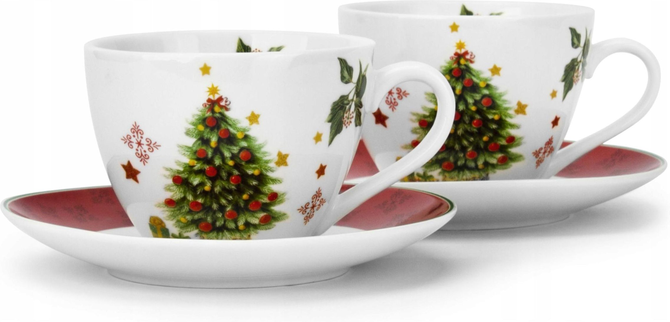 Zestaw dwóch porcelanowych filiżanek ze spodkami z motywem świątecznym. Filiżanki zapakowane zostały w ozdobne pudełko z tym samym motywem. Filiżanka o pojemności 280 ml (pojemność liczona po rant filiżanki). Białe kubeczki ze spodkami z motywem pięknie przystrojonej choinki otoczonej prezentami na tle gwiazdek w świątecznych kolorach uroczo prezentują się na świątecznym stole i nie tylko. Święta nierozdzielnie kojarzą nam się ze śniegiem, bałwanem, choinką, ozdobami, prezentami. Każdy z nas lubi upiększać swój dom na ten wyjątkowy czas świąt, dlatego ten filiżanki idealnie wpasują się do naszej aranżacji i przykują niejedno spojrzenie. Wzór: choinka Produkt 2 x filiżanka 2 x spodek 1 x prezentowa pudełko Wymiary Filiżanka: pojemność całkowita: 280 ml pojemność użytkowa: około 250 ml wysokość: 7,3 cm średnica: 9 cm Spodek średnica: 14 cm Pudełko: szerokość: 16,5 cm długość: 26,5 cm wysokość: 9,5 cm Materiał porcelana Użytkowanie dopuszczone do kontaktu z żywnością
