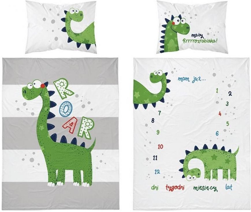 Pościel bambusowa 100x135 Dinozaury biała szara zielona paski 3527 A Dino do łóżeczka dwustronna poszewka 40x60 6091. Pościel bambusowa cieszy się coraz większą popularnością. Hipoalergiczna, miękka, wyjątkowo odporna na zabrudzenia, posiadająca właściwości antybakteryjne i antygrzybiczne umożliwia dobry i komfortowy sen. Wykonana z unikatowej tkaniny bambusowo-bawełnianej jest miękka, a zarazem wytrzymała. Oprócz fantastycznej miękkości, pościel bambusowa jest wytrzymała i przewiewna. Z powodu swoich niezwykłych właściwości termoregulacyjnych pościel bambusowa nadaje się zarówno na upalne, letnie noce dając uczucie lekkości i chłodu, a podczas zimowych, mroźnych miesięcy zapewniając ciepłe otulenie. Dwustronna poszwa na pościel dodatkowo urozmaici wygląd sypialni Twojej pociechy. Dobierz do niego kołdrę, poduszkę oraz prześcieradło, dzięki czemu w prosty sposób stworzysz perfekcyjną aranżację łóżeczka. Pościel ta jest doskonałym pomysłem na prezent. W skład kompletu pościeli wchodzą: - poszwa na kołdrę 100x135 ±3cm - 1 szt. - poszewka na poduszkę 40x60 ±3cm - 1 szt. Materiał: 50% bawełna, 50% bambus Poszwa i poszewka zapinane na suwak. Gramatura: 120 g/m2 Przepis konserwacji: pościel należy wyprać przed pierwszym użyciem, prać w temperaturze 40°C, prać na lewej stronie z podobnymi kolorami, nie chlorować, można suszyć delikatnie w suszarce bębnowej, prasować w temperaturze do 150°C, nie czyścić chemicznie.