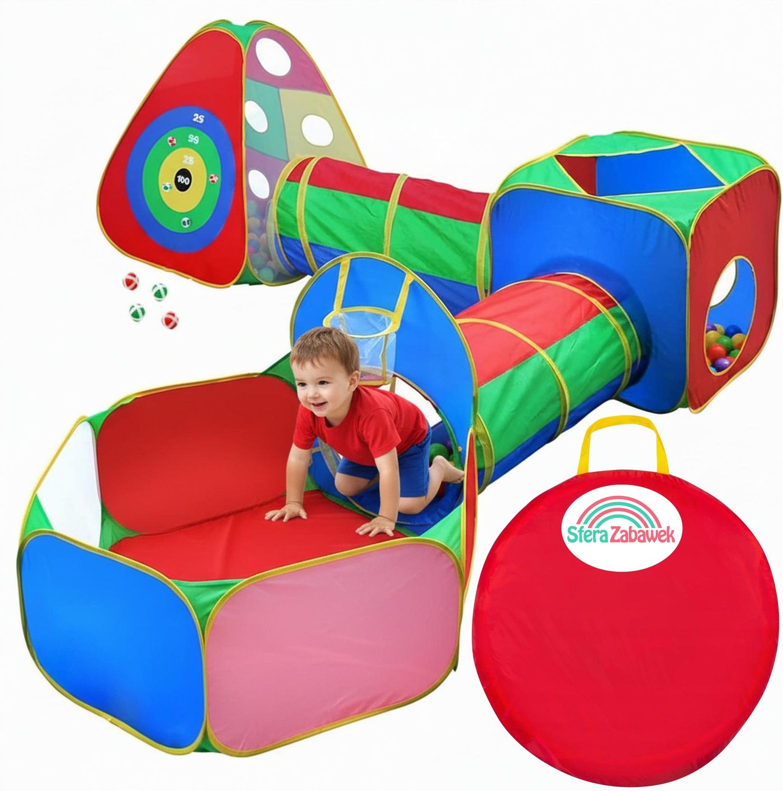 Gigantyczny Plac Zabaw 5w1 Namiot z Tunelami i Suchym Basenem | sferazabawek - Twoja Strefa Kreatywnej Przygody! Przenieś świat przygody prosto do pokoju swojego dziecka z niezwykłym zestawem 5w1 od sferazabawek! 🚗 Ten wielofunkcyjny namiot labirynt to centrum niekończącej się zabawy, które rozwija sprawność fizyczną i kreatywność. Zestaw składa się z domku z tarczą, kostki, dwóch tuneli oraz suchego basenu z koszykówką. Możliwość dowolnego łączenia elementów sprawia, że zabawa nigdy się nie nudzi! ✨ Wykonany z bezpiecznych, trwałych materiałów, rozkłada się samoczynnie w kilka sekund. To idealna przestrzeń do zabawy w domu i na świeżym powietrzu, wspierająca rozwój motoryczny Twojego malucha. 🧠 WAŻNA INFORMACJA: Zestaw nie zawiera kulek widocznych na zdjęciach w suchym basenie. Gigantyczny Zestaw 5w1: Ten rozbudowany plac zabaw składa się z namiotu iglo z tarczą na rzepy (w zestawie 4 piłeczki), namiotu w kształcie kostki, dwóch tuneli o długości 105 cm każdy oraz dużego suchego basenu z koszem. Elementy można łączyć w dowolnych konfiguracjach, tworząc za każdym razem nowy, ekscytujący labirynt i tor przeszkód dla Twojego dziecka. Rozwój i Edukacja 🧠: Namiot od sferazabawek to nie tylko zabawa, ale i inwestycja w rozwój Twojego dziecka. Czołganie się przez tunele wzmacnia mięśnie, rzucanie do celu i do kosza poprawia koordynację wzrokowo-ruchową, a zabawa w chowanego i odgrywanie ról pobudza kreatywność i wyobraźnię. To fantastyczna zabawka edukacyjna dla maluchów. Bezpieczeństwo i Jakość: Dbamy o bezpieczeństwo najmłodszych. Cały zestaw wykonany jest z wysokiej jakości, wytrzymałej tkaniny poliestrowej i elastycznego stelaża. Materiały są nietoksyczne i łatwe w czyszczeniu. Brak ostrych krawędzi oraz przewiewna konstrukcja zapewniają komfortową i bezpieczną zabawę przez wiele godzin. Błyskawiczne Rozkładanie i Przechowywanie: Dzięki samorozkładającej się konstrukcji typu "pop-up", montaż i demontaż placu zabaw zajmuje zaledwie kilka chwil i nie wymaga żadnych narzędzi. Po złożeniu cały zestaw mieści się w dołączonej, poręcznej torbie z zamkiem błyskawicznym, co ułatwia jego przechowywanie i transport. Idealny do domu, ogrodu czy na wyjazd. 🚗 Idealny Pomysł na Prezent: Szukasz wyjątkowego prezentu, który zachwyci każde dziecko? Ten wielofunkcyjny namiot labirynt to strzał w dziesiątkę! Zapewnia niekończącą się frajdę i wspiera aktywność fizyczną. Pamiętaj, zestaw NIE zawiera kolorowych piłeczek do basenu. W zestawie znajdziesz: 2 domki, 2 tunele, 4 piłeczki na rzepy i torbę.