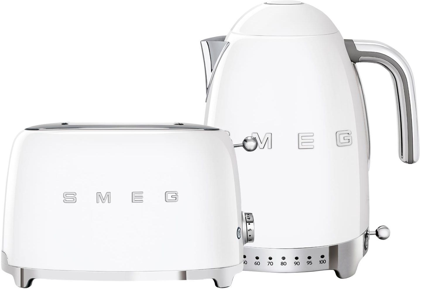 Zestaw Śniadaniowy z KLF04 50'S Retro Style Oferowany zestaw śniadaniowy produktów z linii 50’s Retro Style marki Smeg ułatwi i przyśpieszy przygotowywanie codziennych posiłków. Wykonane z wysokiej jakości materiałów - m.in. tworzywa i stali nierdzewnej - urządzenia mają przemyślany design o opływowych kształtach i chromowanych podstawach, który w połączeniu z neutralnym białym kolorem sprawia, że świetnie zaprezentują się one na blacie kuchennym - można je będzie przechowywać na widoku, gdy akurat nie będą używane. Czajnik o pojemności 1,7 L z pokrywką otwieraną przy użyciu systemu Soft Opening posiada w swoim wnętrzu bezpieczny i praktyczny system grzewczy z ukrytymi elementami grzewczymi. Bezpieczeństwo użytkowania zapewniają automatyczne wyłączanie się po zagotowaniu wody, brak możliwości uruchomienia przy pustym zbiorniku oraz antypoślizgowe, gwarantujące stabilność nóżki. Dodatkowo urządzenie posiada przycisk regulacji temperatury, dzięki któremu można uruchomić próg grzania od minimum 50 do maksimum 100°C, co pozwoli na dostosowanie temperatury wody do własnych potrzeb. Przycisk Keep warm umożliwi z kolei utrzymanie ciepła wody na dłużej - wodę będzie można ugotować wcześniej i poczekać z obsłużeniem gości na odpowiedni moment. Ponadto czajnik wyposażony został w wyjmowany filtr wapienny ze stali nierdzewnej, który ogranicza osadzanie się kamienia w jego wnętrzu. Zaletą produktu jest także podstawa umożliwiająca obracanie w zakresie 360 stopni. Zalety czajnika: Otwieranie pokrywki z systemem Soft Opening  Antypoślizgowe nóżki stabilizujące urządzenie Regulacja temperatury wody od 50 do 100°C Funkcja Keep warm - utrzymywanie ciepła na dłużej Wyjmowany filtr wapienny ze stali nierdzewnej Automatyczne wyłączenie przy 100°C Automatyczne wyłączenie przy pustym czajniku Obracanie czajnika na podstawie 360° Toster na dwie kromki posiada komory o szerokości 36 mm. Pieczywo automatycznie umieszczane jest na ich dnie oraz automatycznie wysuwane po zakończeniu cyklu opiekania, co przyspiesza przygotowywanie tostów. Sześciostopniowa regulacja daje możliwość kontroli poziomu opiekania. Natomiast trzy programy pracy pozwalają na podgrzewanie kromek, rozmrażanie pieczywa oraz przygotowywanie bajgli, co zwiększa zastosowania tostera. Zainstalowana wewnątrz, łatwa w opróżnianiu tacka zbiera okruchy, zapobiegając powstawaniu niepotrzebnego bałaganu wokół urządzenia. Funkcje tostera: 6 stopni opiekania 3 programy: podgrzewanie, rozmrażanie, bajgiel