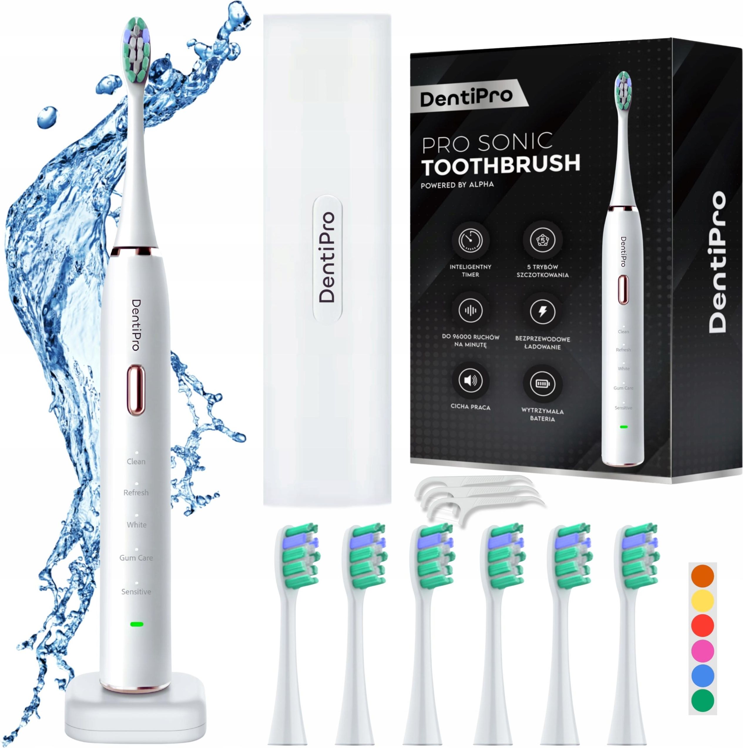 Szczoteczka Soniczna Do Zębów - Zestaw Etui + 6 końcówek - Elektryczna ZADBAJ O TWÓJ PIĘKNY UŚMIECH RAZEM Z NAMI Szczoteczka DentiPro to szczoteczka która pomimo swojej przystępnej ceny, charakteryzuje się parametrami zbliżonymi, a często lepszymi od znacznie droższych urządzeń. Jeśli chcesz cieszyć się zdrowym i pięknym uśmiechem oraz satysfakcją z zakupu - nasz sprawdzony model szczoteczki sonicznej zapewni Ci higienę jamy ustnej na najwyższym poziomie. Szczoteczka jest wodoodporna, wyposażona w 6 wymiennych głowic, co zapewni Ci zapas na 18 miesięcy, zestaw posiada etui podróżne, dzięki któremu możesz zabrać ze sobą szczoteczkę w podróż bez obawy o uszkodzenia! Pojemny akumulator pracuje na pełnym naładowaniu aż do 45 dni. Dzięki 96 000 drgań sonicznych na minutę, skutecznie usuwa płytkę nazębną i resztki jedzenia nawet z trudno dostępnych miejsc. Dodatkowo, w zestawie znajdziesz gratis: praktyczne naklejki, które pomogą w łatwym oznakowaniu końcówek szczoteczek oraz nici dentystyczne do dokładnego czyszczenia przestrzeni międzyzębowych. NIEZBĘDNE TRYBY PRACY DLA PIĘKNEGO UŚMIECHU Szczoteczka soniczna DentiPro została wyposażona w 5 trybów pracy, co pozwala dopasować jej działanie do Twoich potrzeb oraz wrażliwości zębów. Posiada też funkcję zapamiętywania ostatniego trybu pracy dzięki czemu nie musisz za każdym razem ustawiać swojego trybu ponownie. Clean (Czyszczenie): Standardowy tryb do codziennego czyszczenia. Usuwa płytkę nazębną i resztki jedzenia, zapewniając dokładne i skuteczne czyszczenie. Doskonały wybór do codziennego stosowania. Refresh (Odświeżanie): Krótki, intensywny program przeznaczony do szybkiego odświeżenia jamy ustnej w ciągu dnia. Wystarczy minuta, aby poczuć czystość i świeży oddech, np. po posiłku lub przed spotkaniem. Tryb idealny dla osób aktywnych, które chcą zadbać o czystość zębów w każdej sytuacji. White (Wybielanie): Tryb zaprojektowany do usuwania przebarwień z powierzchni zębów. Skutecznie pomaga odzyskać naturalną biel zębów, polerując je i usuwając osady. Idealny dla tych, którzy chcą mieć jaśniejszy uśmiech. Gum Care (Pielęgnacja dziąseł): Tryb delikatnego masażu dziąseł, który poprawia ich ukrwienie i wzmacnia je. Sensitive (Delikatny): Tryb dla osób z wrażliwymi zębami lub dziąsłami. Zapewnia delikatne czyszczenie, minimalizując ryzyko podrażnień. Świetny dla tych, którzy potrzebują bardziej łagodnego podejścia oraz dla osób z problemami z przyzębiem, mostami i koronami. Szczoteczka DentiPro posiada inteligentny system ładowania, który zapobiega przeładowaniu baterii i dba o jej długą żywotność. Gdy akumulator jest w pełni naładowany, wskaźnik świeci na zielono i ładowanie jest automatycznie blokowane. Dopiero po spadku poziomu baterii i zapaleniu się czerwonego wskaźnika, urządzenie umożliwia ponowne ładowanie, co zwiększa efektywność energetyczną i wydłuża czas pracy akumulatora. INTELIGENTNY TIMER DLA PERFEKCYJNEGO SZCZOTKOWANIA Inteligentny timer w szczoteczce DentiPro został zaprojektowany z myślą o prawidłowej technice szczotkowania. Urządzenie co 30 sekund wykonuje krótką przerwę, sygnalizując konieczność zmiany obszaru czyszczenia — dzięki temu każda część jamy ustnej otrzymuje odpowiednią uwagę. Po 2 minutach szczoteczka automatycznie się wyłącza, co odpowiada czasowi zalecanemu przez stomatologów. Ten system nie tylko ułatwia codzienną higienę, ale także pomaga wyrabiać nawyki, zapewniając dokładne i równomierne szczotkowanie każdego dnia. NAJWAŻNIEJSZE CECHY I ZALETY SZCZOTECZKI SONICZNEJ DO ZĘBÓW DENTIPRO 96 000 drgań sonicznych na minutę zapewnia wyjątkowo głębokie i delikatne czyszczenie, docierając do trudno dostępnych miejsc. 5 trybów pracy umożliwia Ci dostosowanie szczotkowania do indywidualnych potrzeb. Inteligentny timer pomaga utrzymać zalecany przez dentystów czas szczotkowania, dbając o równomierne czyszczenie wszystkich partii jamy ustnej. Wykonanie końcówek z oryginalnych włókien DuPont - trwałe, bezpieczne i delikatne dla dziąseł. Zachowują sprężystość i skuteczność czyszczenia przez wiele tygodni. Około 45 dni pracy na jednym ładowaniu sprawia, że szczoteczka jest wygodna w codziennym użytkowaniu, zwłaszcza podczas podróży. Zapas wymiennych końcówek na 18 miesięcy gwarantuje Ci długotrwałe użytkowanie bez konieczności częstego zakupu nowych końcówek. Wodoszczelność IPX7 to bezpieczeństwo i komfort użytkowania nawet pod prysznicem czy w wannie. Ładowanie indukcyjne eliminuje konieczności podłączania kabli, co zwiększa wygodę i estetykę użytkowania. Białe etui podróżne to stylowy dodatek i praktyczne przechowywanie szczoteczki w podróży. Czytelny, podświetlany wyświetlacz to łatwość obsługi i monitorowania trybów pracy nawet w słabym oświetleniu. Biała szczoteczka stworzona w nowoczesnym, eleganckim designie, który wpisuje się w stylowe wnętrza łazienki. PRZEWAGA SZCZOTECZKI SONICZNEJ NAD MANUALNĄ Korzystanie ze szczoteczki sonicznej jest przyjemniejsze i wygodniejsze: Wbudowany timer pomaga utrzymać zalecany czas szczotkowania. Lepiej dociera do trudno dostępnych miejsc (szczoteczki soniczne usuwają nawet do 7x więcej płytki nazębnej niż szczoteczki tradycyjne). Zmniejsza krwawienie i zapalenie dziąseł. Pomaga w usuwaniu kamienia nazębnego. Szczoteczka soniczna DentiPro w porównaniu do szczoteczek elektrycznych jest dokładniejsza oraz delikatniejsza dla zębów i dziąseł. PARAMETRY TECHNICZNE SZCZOTECZKI SONICZNEJ DO ZĘBÓW DENTIPRO Wysokość: 23,5 cm; Szerokość: 2,5 cm; Ilość trybów pracy: 5 Materiał wykonania: ABS Ilość wymiennych końcówek: 6 Inteligentny timer: Tak Ilość drgań sonicznych: 96 000 Wodoszczelność: IPX7 Sposób ładowania: ładowanie indukcyjne Podświetlany wyświetlacz: Tak Instrukcja obsługi w języku