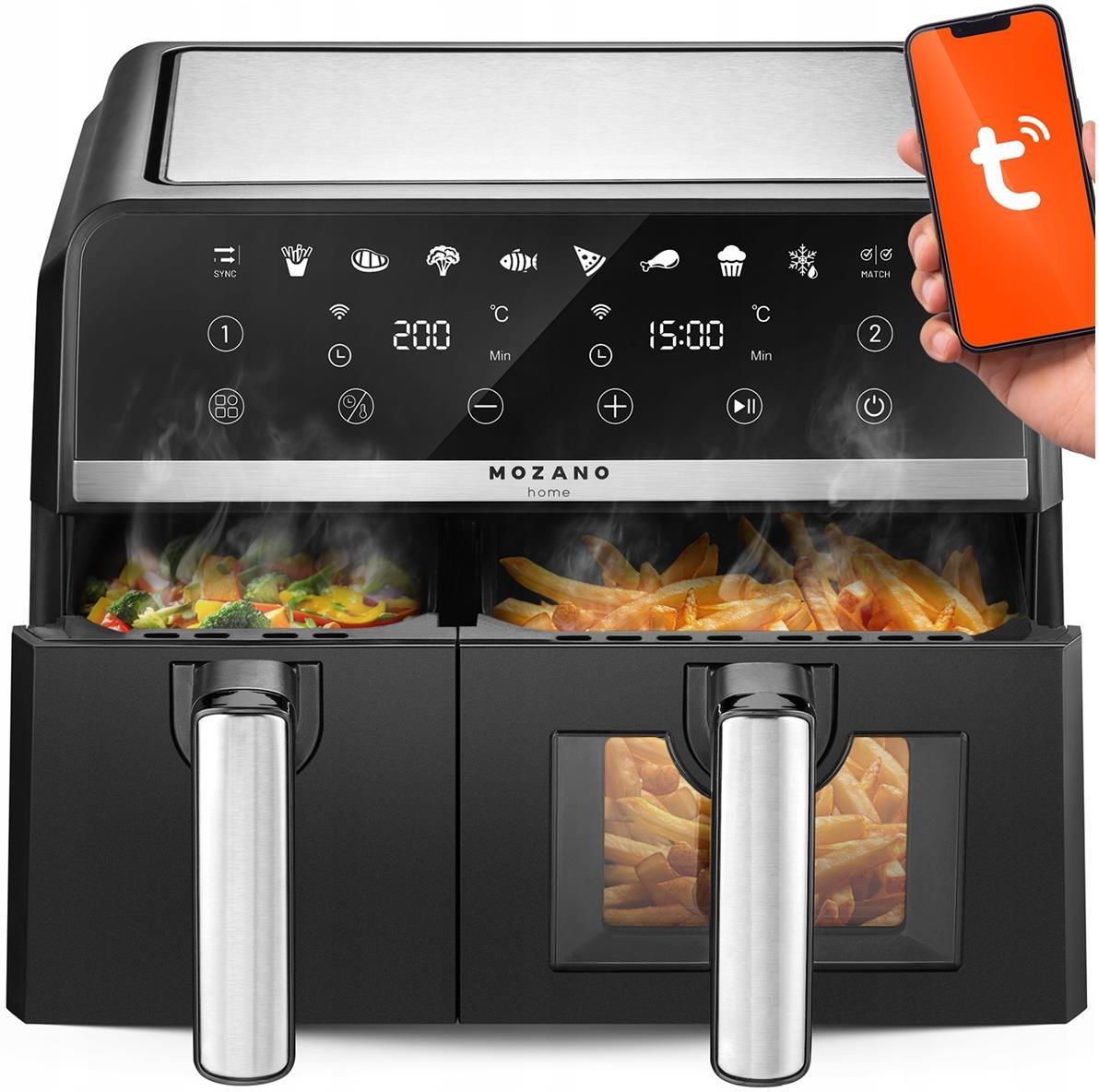 FRYTKOWNICA BEZTŁUSZCZOWA PODWÓJNA 9L FRYTOWNICA AIR FRYER DWUKOMOROWA WiFi Moc 2600W | 8 programów | Dwie komory 5,5L + 3,5L = 9L | Kratka do pieczenia | Dotykowy panel | Zakres temperatur 40 - 200°C | Czas pracy do 60 min | Okienko | Lampka kontrolna wewnątrz urządzenia | Sterowanie poprzez WiFi …