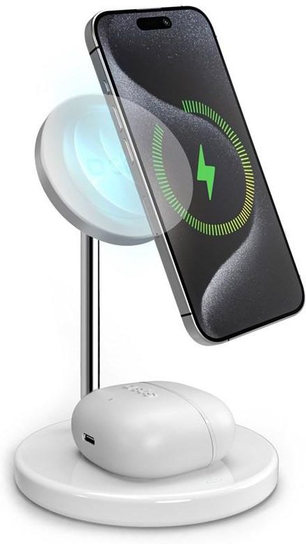 Stacja ładująca SBS bezprzewodowa Qi2 2w1 15W Odkryj wygodę dzięki bezprzewodowej stacji ładującej Qi2 2x1, zaprojektowanej z myślą o potrzebach Twojego cyfrowego życia. Ta bezprzewodowa ładowarka oferuje dwa dedykowane gniazda: jedno na iPhone'a lub smartfon z systemem Android kompatybilny z ładowaniem bezprzewodowym, a drugie na bezprzewodowy zestaw słuchawkowy, dzięki czemu wszystkie urządzenia są zawsze gotowe do użycia. Stacja jest w pełni kompatybilna z technologią MagSafe, pozwalającą na bezpieczne i stabilne ładowanie urządzeń Apple. Oznacza to, że możesz ładować iPhone'a 15/14/13/12. Ciesz się swobodą bezprzewodowego ładowania wszystkich urządzeń kompatybilnych z Qi i Qi2. Korzyści: - Technologia Qi2 - Możliwość ładowania jednocześnie smartfona i bezprzewodowego zestawu słuchawkowego - Ładuje zarówno smartfony z systemem Android, jak i iPhone - Kompatybilna z ładowaniem MagSafe - Magnetyczne dokowanie smartfona za pomocą technologii Magnetic Power Profile - Kabel Usb-C do zasilania w zestawie podłącz do ładowarki sieciowej (brak w zestawie).