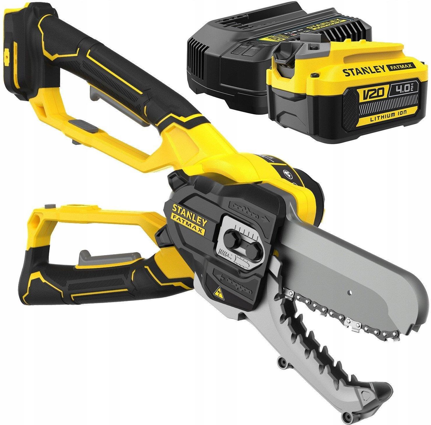 Stanley Fatmax SFMCPS515B-XJ AKUMULATOROWY Sekator łańcuchowy do gałęzi drewna + 4Ah + ładowarka Sekator łańcuchowy Stanley Fatmax SFMCPS515M1-QW to wysokiej jakości narzędzie akumulatorowe, idealne do przycinania gałęzi i innych prac ogrodniczych. Dzięki zasilaniu z akumulatora Li-Ion o napięciu 18V z serii Stanley Fatmax V20, sekator oferuje dużą moc oraz pełną mobilność, co sprawia, że jest wygodny i łatwy w użyciu. Zestaw zawiera akumulator oraz ładowarkę, co umożliwia natychmiastowe rozpoczęcie pracy. Dodatkowo, akumulator jest kompatybilny z innymi narzędziami z tej samej serii, co zwiększa jego wszechstronność i wygodę użytkowania. Cechy szczególne Stanley Fatmax SFMCPS515M1 Zestaw gotowy do pracy, z akumulatorem i ładowarką w komplecie Możliwość stosowania tego samego akumulatora i ładowarki do pozostałych narzędzi i urządzeń z tej samej serii Wysoka mobilność dzięki zasilaniu akumulatorowemu Ergonomiczny design ułatwiający długotrwałe użytkowanie Dane techniczne Stanley Fatmax SFMCPS515M1 Zasilanie: akumulatorowe Napięcie zasilania: 18V Seria: Stanley Fatmax V20 Technologia akumulatorów: Li-Ion Ilość akumulatorów w zestawie: 1 Pojemność akumulatora: 4,0 Ah Zestaw Stanley Fatmax SFMCPS515M1-QW zawiera Sekator łańcuchowy Stanley Fatmax SFMCPS515M1-QW Akumulator 18V o pojemności 4,0 Ah Uniwersalna ładowarka Instrukcja obsługi DANE TECHNICZNE Typ urządzenia - piła-nożycowa (do gałęzi) Napięcie baterii - 18 V (stanowi część systemu V20 firmy Stanley) Długość prowadnicy / listwy tnącej - 15 cm (ok. 150 mm) Łańcuch - 1/4" Prędkość łańcucha - ok. 1,9 m/s Zakres cięcia gałęzie / pędy o średnicy - od ~ 25 mm do ~ 100 mm Masa urządzenia - ok. 2,05 kg (z baterią) Wymiary urządzenia wysokość - 110 mm, szerokość - 215 mm, głębokość - 435 mm System smarowania - automatyczne / półautomatyczne olejowanie łańcucha Napinanie łańcucha - automatyczne naprężanie łańcucha Mechanizm chwytania gałęzi - opatentowany mechanizm szczęk trzymających Sterowanie bezpieczeństwem - wytłumiona obsługa dwuręczna / zabezpieczenie przed przypadkowym uruchomieniem