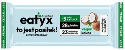 Baton proteinowy Hyperfood marki EATYX to pełnowartościowy wegański baton wysokobiałkowy o smaku kokosowym zawiera cukier i substancję słodzącą. Doskonały zamiennik tradycyjnych posiłków.