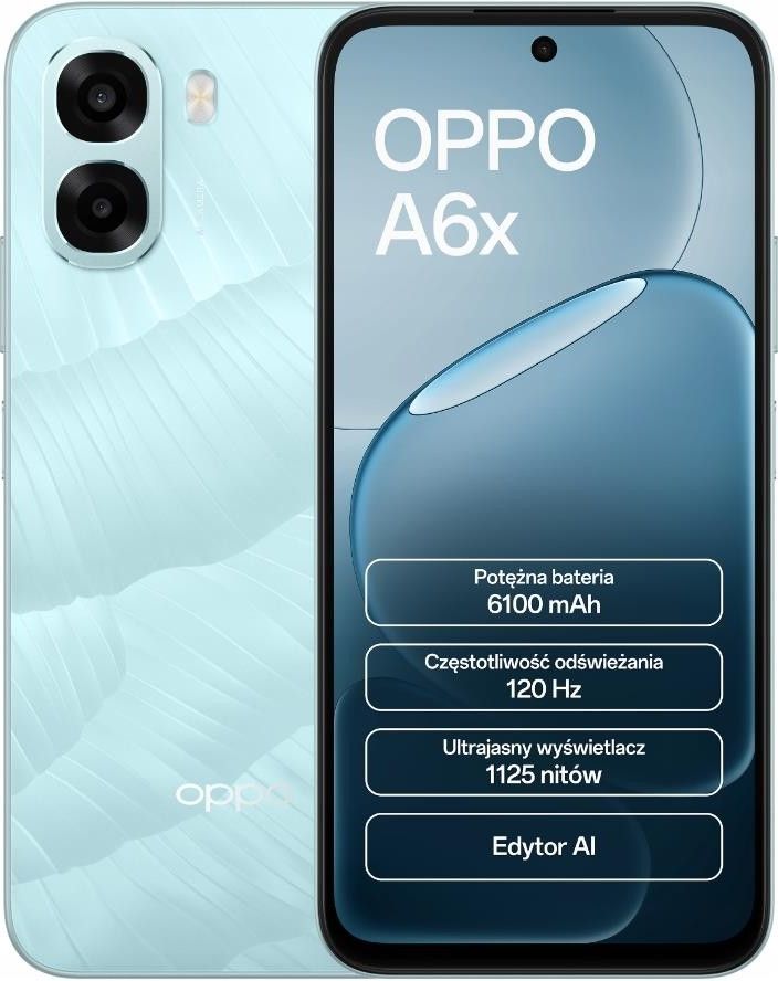 Oppo A6X CPH2819 4/128GB Niebieski Wymiary Wymiary: 166.6 × 78.5 × 8.61 mm Waga: ok. 210 g Kolor: Ice Blue (oraz Plum Purple i Violet Purple) Obudowa: plastikowa, odporność IP64 — odporność na zachlapania i kurz Ekran Typ: 6.75″ IPS LCD Rozdzielczość: HD+ 1570 × 720 Odświeżanie: do 120 Hz Touch sampling: do 240 Hz Jasność max: do 1125 nitów (HBM) Stosunek ekranu do obudowy: ~90.6 % Głębia kolorów: 16.7 mln Wydajność System operacyjny: Android 15 z ColorOS 15 Chipset: Qualcomm Snapdragon 685 (4G) CPU: 8-rdzeniowy GPU: Adreno 610 RAM: 4 GB LPDDR4X Pamięć wewnętrzna: 128 GB UFS 2.2 Możliwość rozszerzenia pamięci przez microSD Aparaty Tył: 13 MP (główny szerokokątny, f/2.2, AF) + dodatkowy QVGA (monochromatyczny) Przód: 5 MP (f/2.2) Tryby zdjęć i wideo: portret, noc, panoramowanie, time-lapse itp. Nagrywanie wideo: 1080p @30 fps Bateria i ładowanie Pojemność: 6500 mAh (typ.) Ładowanie: brak szybkiego ładowania (standardowe) Dodatkowe informacje Dystrybucja Europejska Menu w dostępne w każdym języku obowiązujacym na terenie UE Sprzęt: nowy, zaplombowany