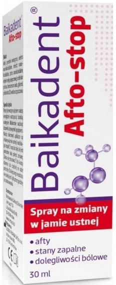 Baikadent Afto-stop może być stosowany wspomagająco podczas łagodzenia dolegliwości bólowych wywołanych przez niewielkie zmiany w jamie ustnej takie jak: -aftowe zapalenia jamy ustnej, -owrzodzenia aftowe, -zmiany wywołane noszeniem aparatu ortodontycznego, -zmiany wywołane przez niewłaściwie dopasowane protezy. Preparat Baikadent Afto-stop dostępny jest w postaci sprayu (płynu zawierającego aplikator) umieszczonego w butelce o pojemności 30 ml (300 dawek).