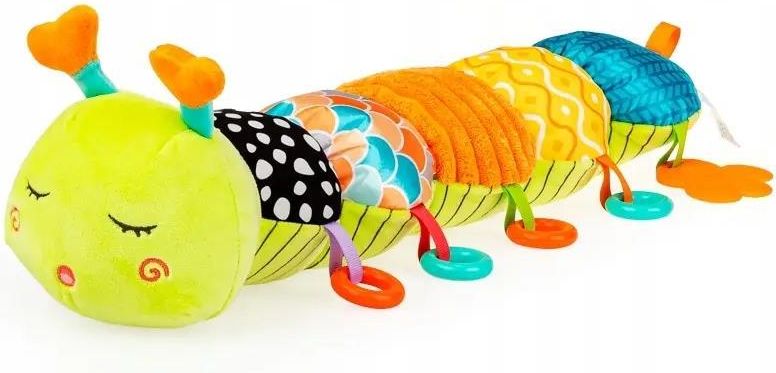 Kolorowa gąsieniczka grzechocze wesoło, zachęcając maluchy do wspólnej zabawy! Poszczególne segmenty jej ciałka uszyte zostały z materiałów o różnych fakturach, w tym takiego, który szeleści, a wszystko po to, aby stymulować zmysły dziecka, wpływając korzystnie na rozwój jego zdolności poznawczych. Zabawka wyposażona została w gryzaczek, kolorowe kółeczka oraz grzechotkę, ukrytą w ostatnim segmencie. Na brzuszku gąsienicy znajduje się miarka w centymetrach i calach, którą można wykorzystać do wesołych zdjęć dziecka z zabawką, a gdy maluch podrośnie - do nauki liczenia. Produkt przeznaczony jest dla dzieci od 10 miesiąca życia. Cechy produktu: zróżnicowane faktury materiałów; szeleszczące elementy; grzechotka; gryzak; kolorowe kółeczka; miarka w centymetrach i calach; wiek: 10m+. EAN: 6925783826071
