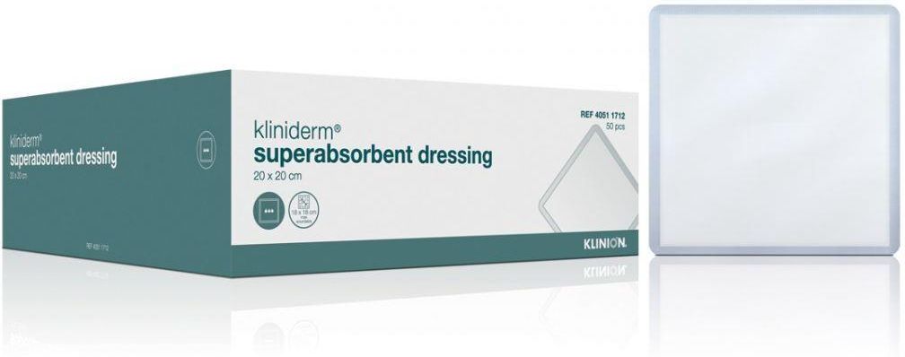 Kliniderm Superabsorbent Wyrób medyczny w postaci chłonnego opatrunku. Produkt, dzięki swoim wysoce absorbującym właściwościom, przeznaczony jest do zaopatrywania umiarkowanie lub silnie sączących się ran. Wymiary: 20 cm x 20 cm.