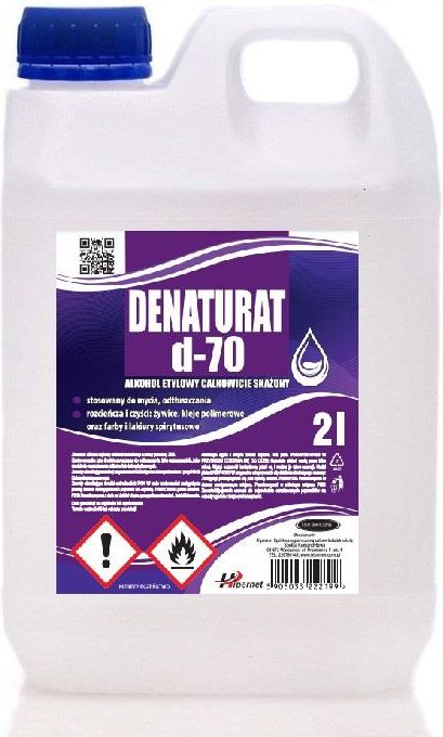 Denaturat D-70 Alkohol całkowicie skażony biały o pojemności 2L. Ten wysokiej jakości denaturat jest idealnym rozwiązaniem do czyszczenia, odtłuszczania oraz usuwania wszelkich zabrudzeń. Jest niezastąpiony zarówno w przemyśle, jak i w gospodarstwie domowym. Denaturat D-70 został specjalnie opracowany, aby skutecznie rozcieńczać i czyścić żywice, kleje polimerowe, farby i lakiery spirytusowe. Posiada silne właściwości oczyszczające, które pomagają w skutecznym usuwaniu nawet najtrudniejszych plam i zabrudzeń. Nasz denaturat został szczegółowo przetestowany i spełnia najwyższe standardy bezpieczeństwa i jakości. Doskonale nadaje się zarówno do użytku profesjonalnego, jak i domowego. Jego praktyczne opakowanie o pojemności 2L sprawia, że jest wygodne w użyciu i łatwe do przechowywania.