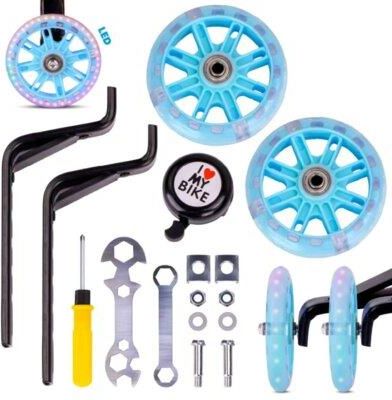 Kompletny zestaw do rowerka dziecięcego, idealny dla małych rowerzystów uczących się jazdy. Boczne kółka zapewniają stabilność i bezpieczeństwo, a świecące LED-y dodają efektu wizualnego. Całość uzupełnia klasyczny, czarny dzwonek z napisem, który nie tylko wygląda stylowo, ale i poprawia bezpieczeństwo na drodze.